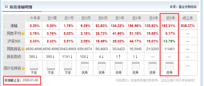 以上数据来自天天基金网,截止2026年1月9日,易方达科融混合 (006533)近5年收益率182.11%, 在同类1461只基金中,排名第1。近一年的收益率142.22%,是同类平均水平41.80%的3倍多,是同期沪深300指数25.03%的近5倍。
