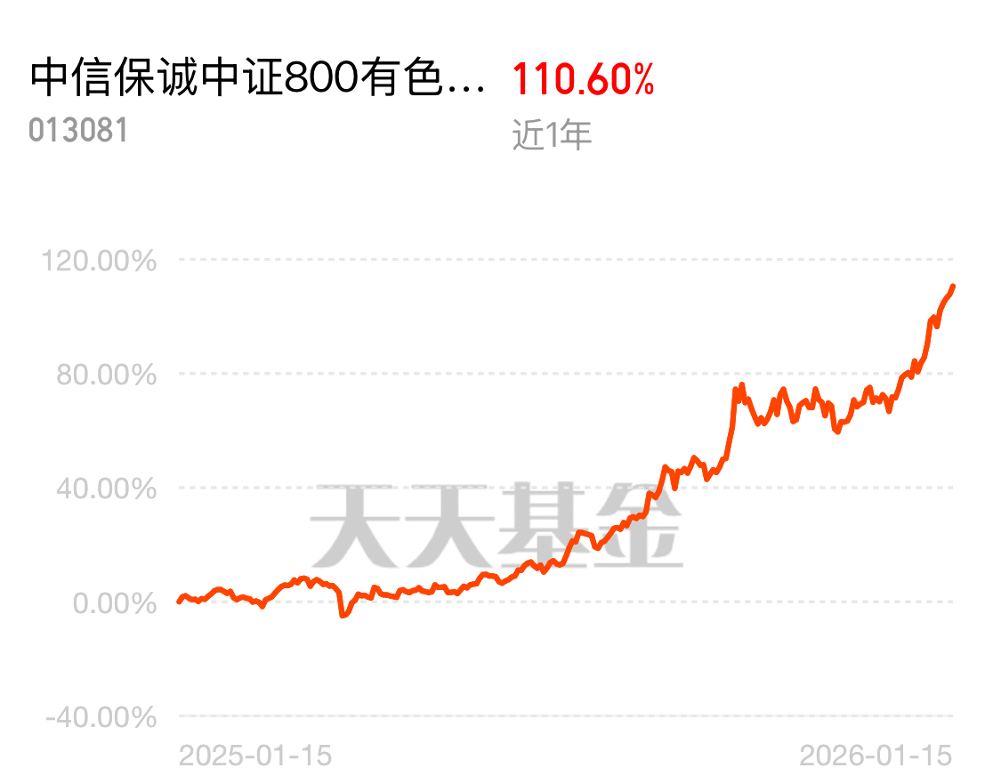 近期有色板块热度不减,五连阳走势停不下来,开盘继续领涨。中信保诚中证 800 有色指数 (LOF) C 稀有金属含量高,资产质地优质,近 1 年涨幅 110.60%,收益相当可观,讨论区福利红包还在,赶紧去领一波福利。$中信保诚中证800有色指数(LOF)C$