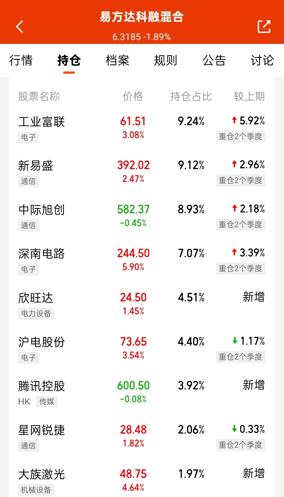 易方达科融混合,近6个月涨超70%,近一年涨115.6%,持有工业富联、新易盛这些算力龙头,还有深南电路、腾讯控股,持仓是高景气赛道,上涨弹性大,收益自然就上去了,基金长期业绩稳健。