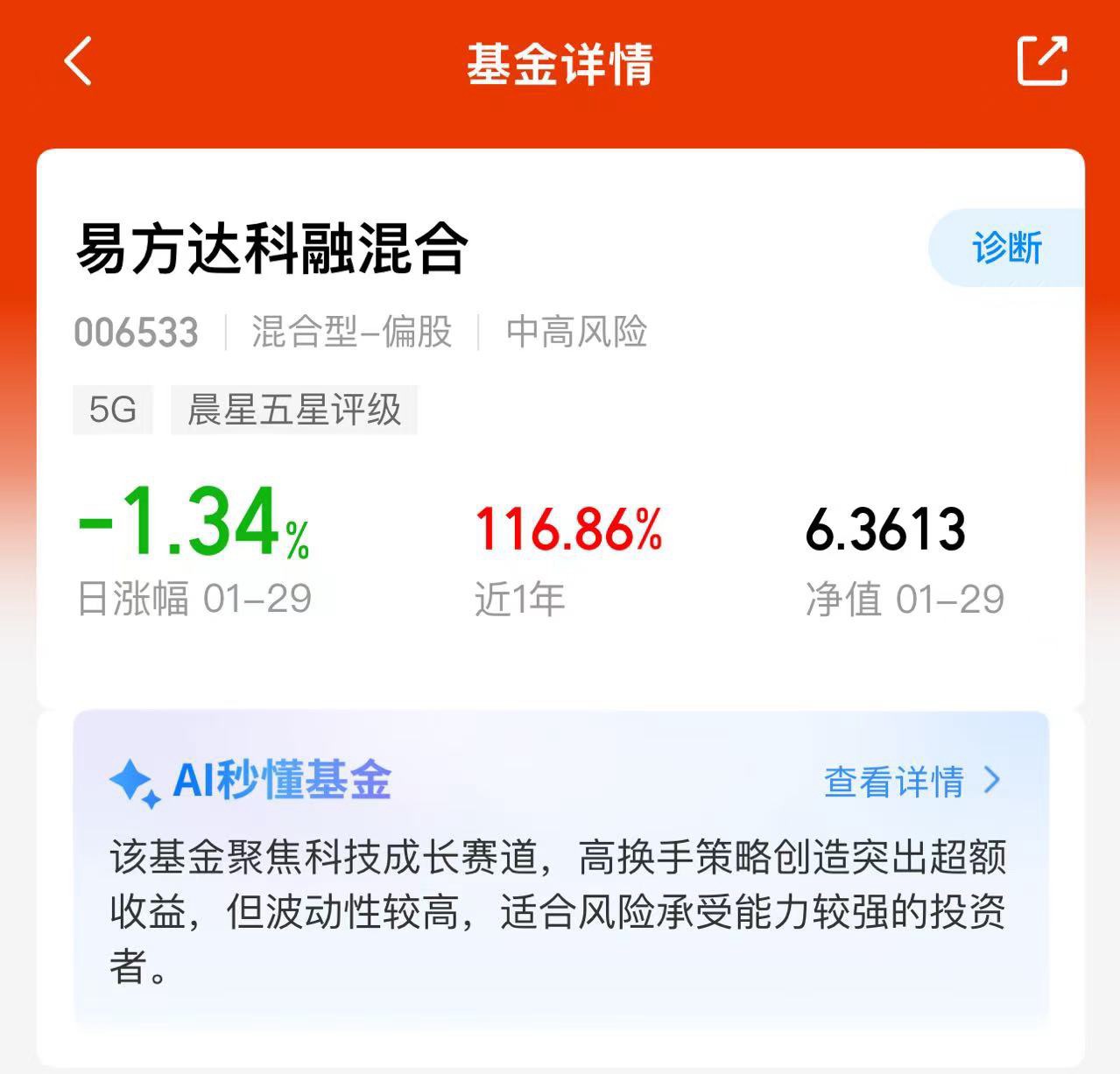 今天市场整体分化得挺明显,但科技板块依旧稳得住,cpo算力产业链还又一波爆发了。$易方达科融混合$ 这只主动科技基太会布局了,主打科技成长赛道,还配了银行这类周期防守板块,持仓特别均衡。长期赚钱能力超稳,近一年涨幅都超116%,还总创新高,期待后续继续突破冲新高!