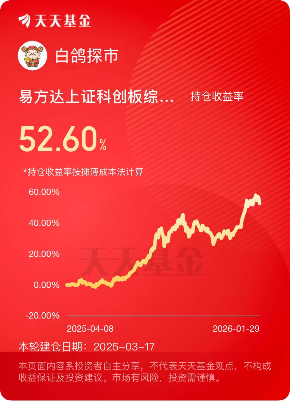 相信贝塔的力量:我意识到,对于普通投资者,在科技周期的上升阶段,买入“整个板块”比“精选个股”更安全。因为技术迭代太快,今天的龙头明天可能就被颠覆(如某光模块龙头),但指数会自动优胜劣汰。易方达科创综指的定期调仓机制,帮我自动剔除了那些掉队的公司。