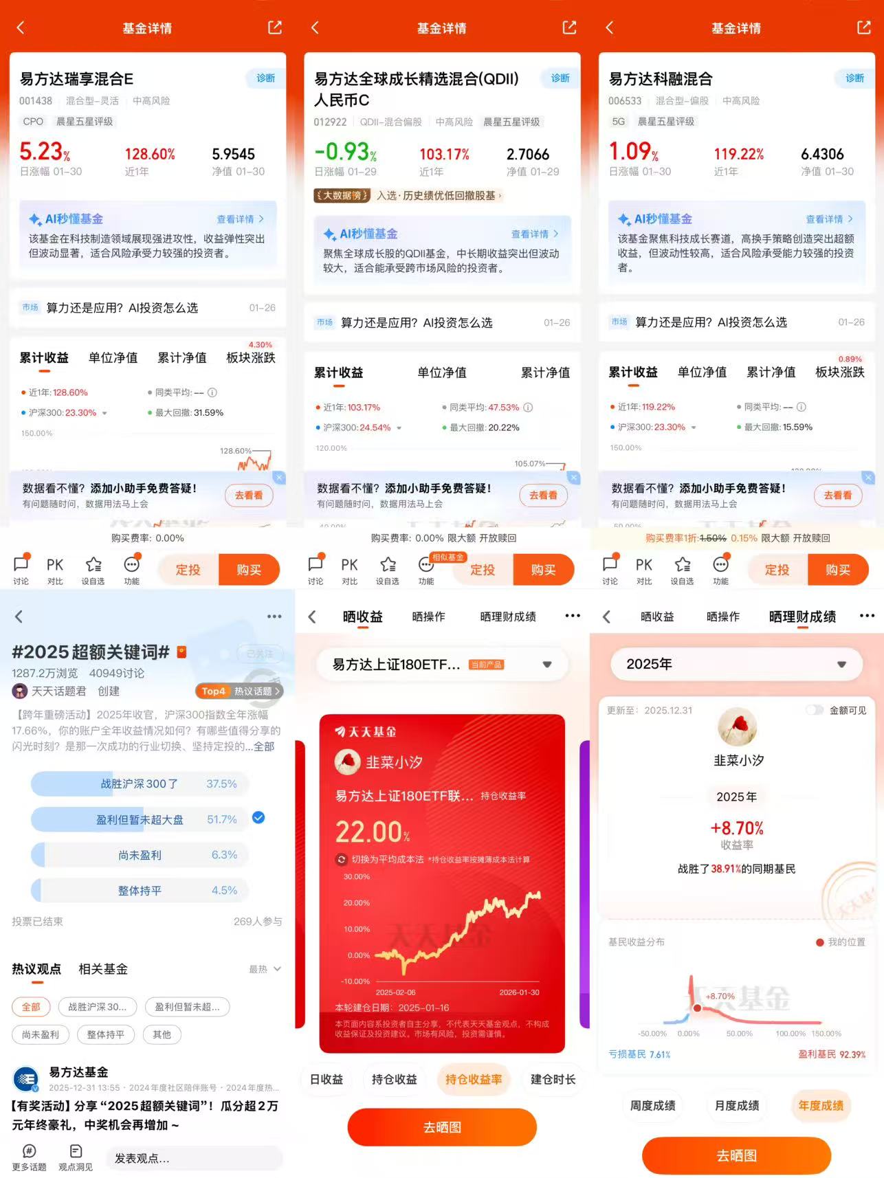 2025年,当市场因经济复苏预期转向消费、金融等传统板块时,我的科技组合仍贡献了主要收益。超额收益从来不是靠运气,而是“在正确的时间做反人性的事”——当市场沉迷于短期热点时,坚守长期产业趋势;当所有人恐惧时,用数据和逻辑寻找机会;当风口来临时,用风控守住果实。2025年的成绩,是我对“科技周期信仰”的一次验证,也是对“逆向投资纪律”的最好回报。@易方达基金