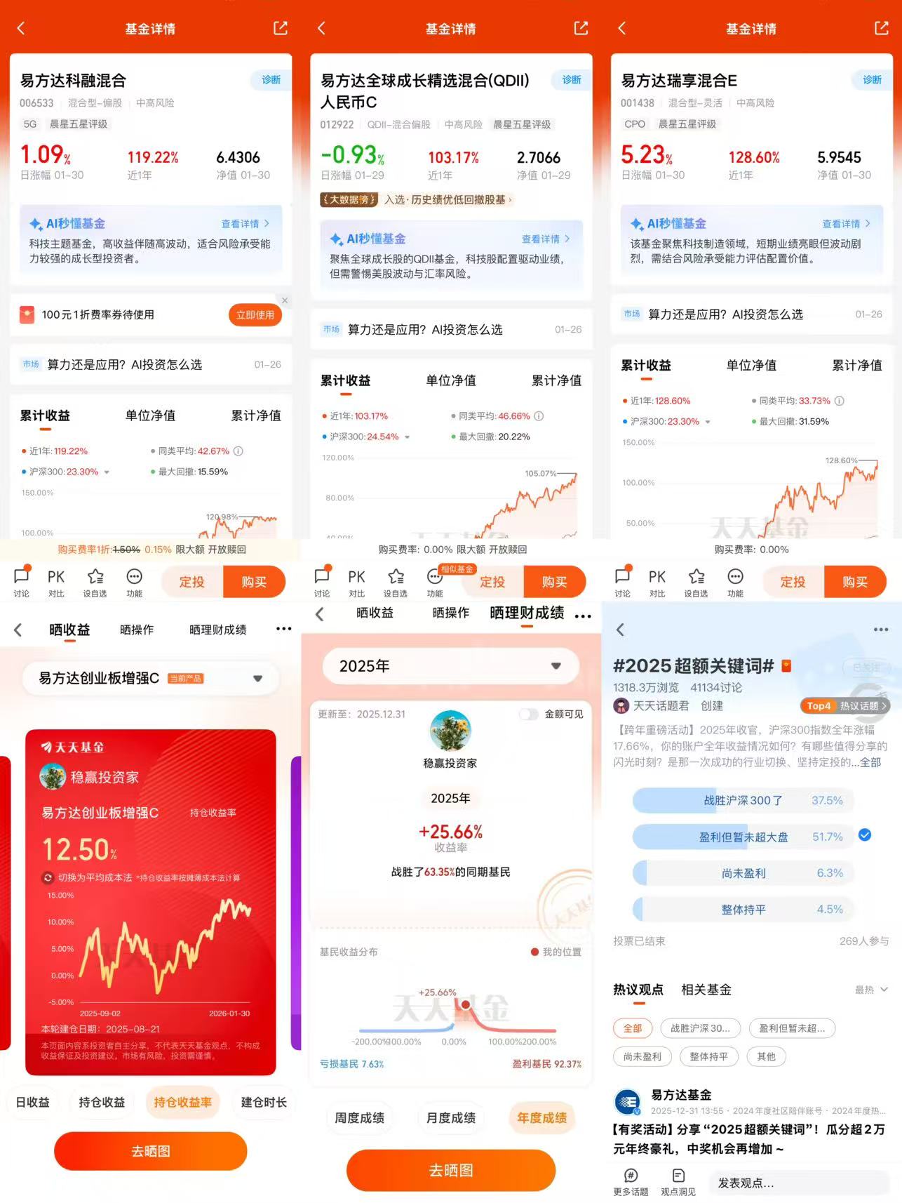 过程中,我也踩过"追热点"的坑——曾因某新能源基金短期涨幅亮眼而跟风买入,结果因估值过高回调被套,最终止损离场。这让我更加坚定:不赚认知外的钱,只在能力圈内深耕。通过持续学习行业研究报告、跟踪基金经理的投资逻辑,我逐渐形成了"估值+业绩+政策"三维度的选股框架,避免了情绪化操作。我始终坚持"逆向布局+长期持有"的策略,在市场的喧嚣中保持定力,让时间成为投资的朋友。@易方达基金