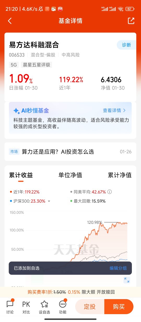 展望2026年,我依然看好“新质生产力”这条主线,并且已经把易方达科融混合作为核心布局标的。这只基金的投资风格刚好契合我的策略:既通过配置高端制造、AI、半导体等成长赛道把握产业升级红利,又兼顾消费、医药等价值板块做均衡配置,和我2025年的思路不谋而合。基金经理在行业轮动中的调仓能力也很出色,能在不同阶段精准捕捉高景气方向,这正是我2026年想要的“攻守兼备”。