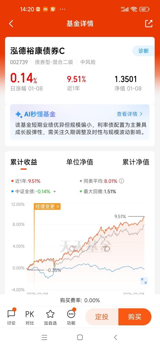 连涨6天,持续创新高,近一年+9.51%,是能稳定增强的固收+,可以放心。