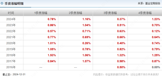 正因为债券资产久期相对更短,受市场利率波动影响较小,历史上看,即便是债市出现较大幅度的回调,该产品的表现也会相对更稳健一些,自成立后每个季度都是正回报。