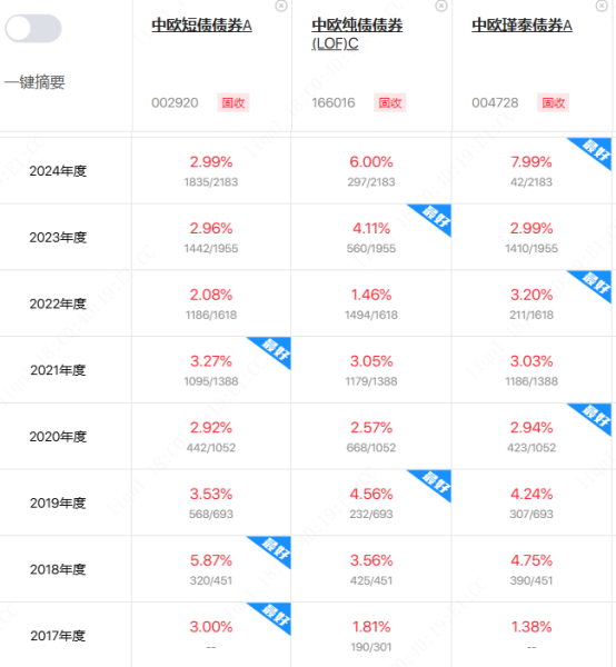 如果风险承受能力再稍稍高一点,中欧旗下的中欧瑾泰债券A、中欧纯债债券C/E成立时间都在七年以上,从2017年-2024年也都是年年正回报。