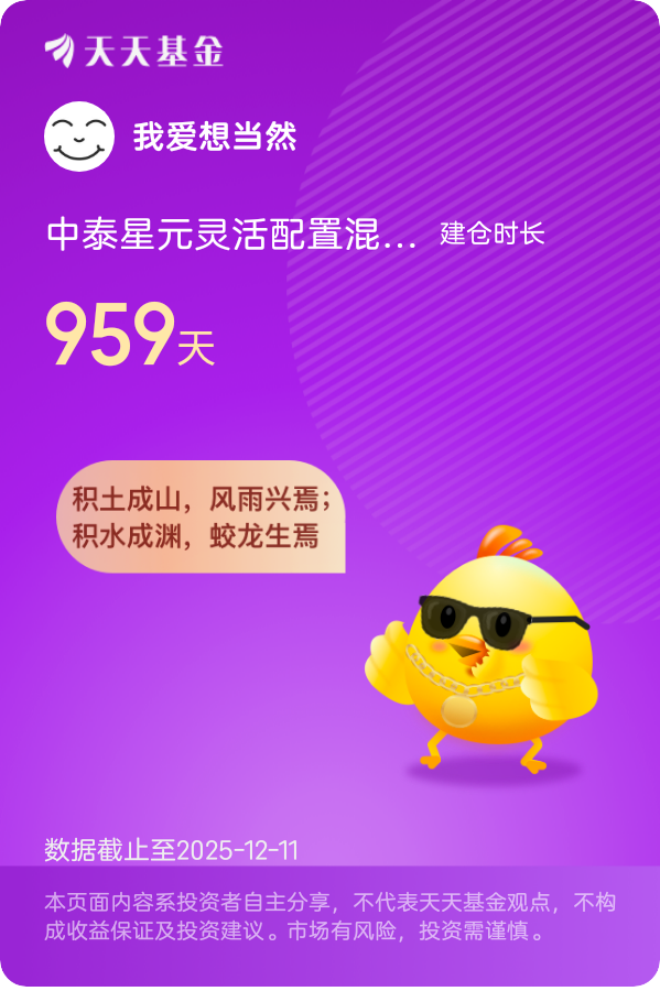 差不多一个月回了四个点了吧,这个应该是我唯一躺平不太留意的货,今天加仓了点,给今天腾出来的钱安置一下,年底了。$中泰星元灵活配置混合A$ $中泰星元灵活配置混合A$ #晒收益#