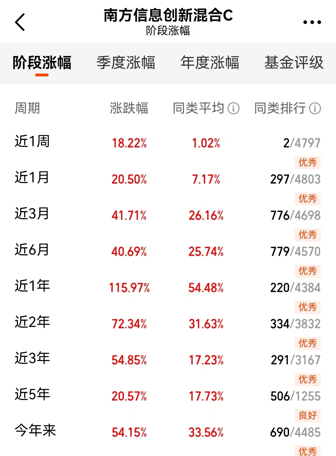 朋友们,看看$南方信息创新混合A$(007490)的业绩吧!近一年115%多的收益率,近三个月也涨了41%以上,这还不是主力资金看好是什么?半导体行业反转迹象这么明显,国产替代的需求又那么迫切,明年业绩想象空间很大。现在布局我觉得性价比还行,市场热度也高,真的不要错过这种能跟上行情的产品。#“924行情”一周年 你赚了多少?#