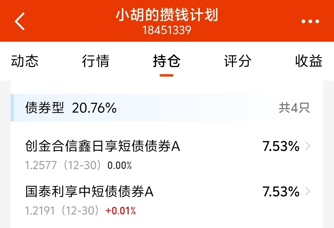 这个组合,短久期固收产品的持仓比例累计差不多70%左右,凸显的主题和攒钱计划一致。