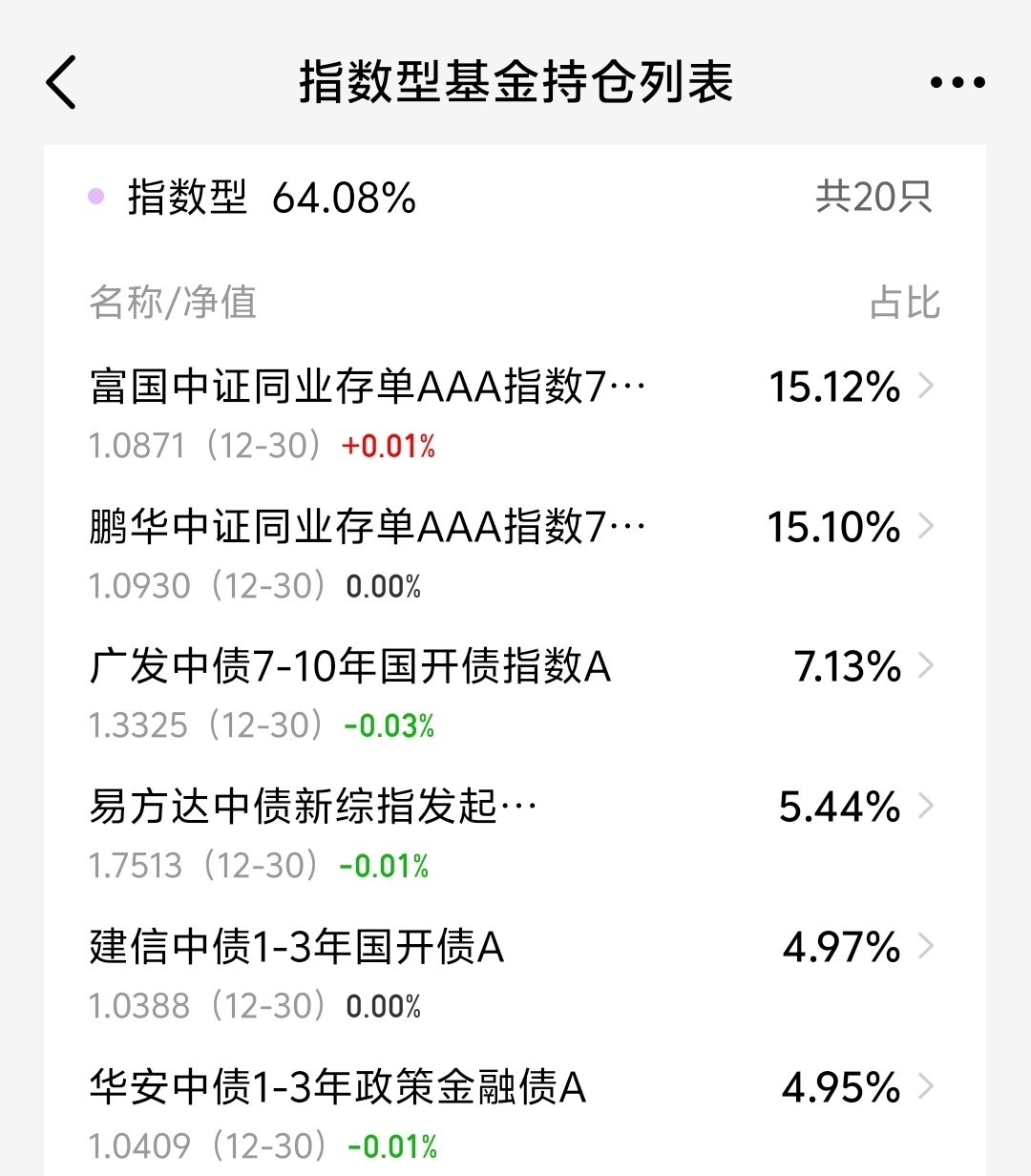 剩余的30%的仓位,则是中长久期债券基金,兼顾主动与被动,纯债与一级债基,权益宽基指数等,做收益增厚。