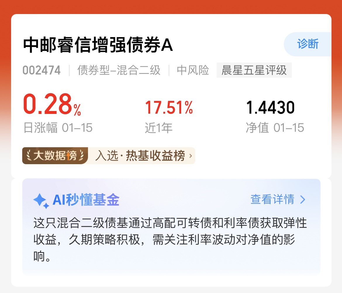 投资不求一夜暴富,但求细水长流。$中邮睿信增强债券A$ 的固收+,昨天28个蛋,给力,还有更多的机会,继续拿着