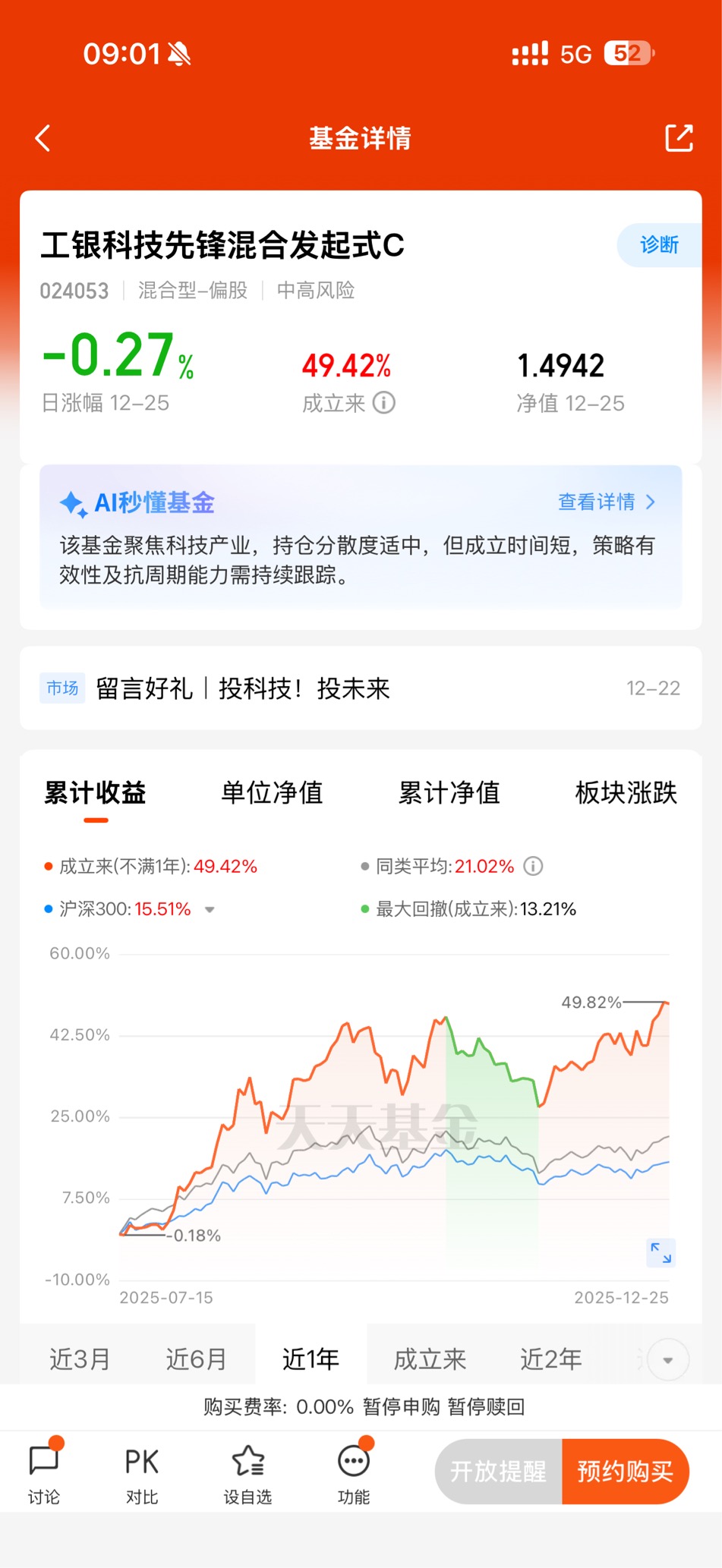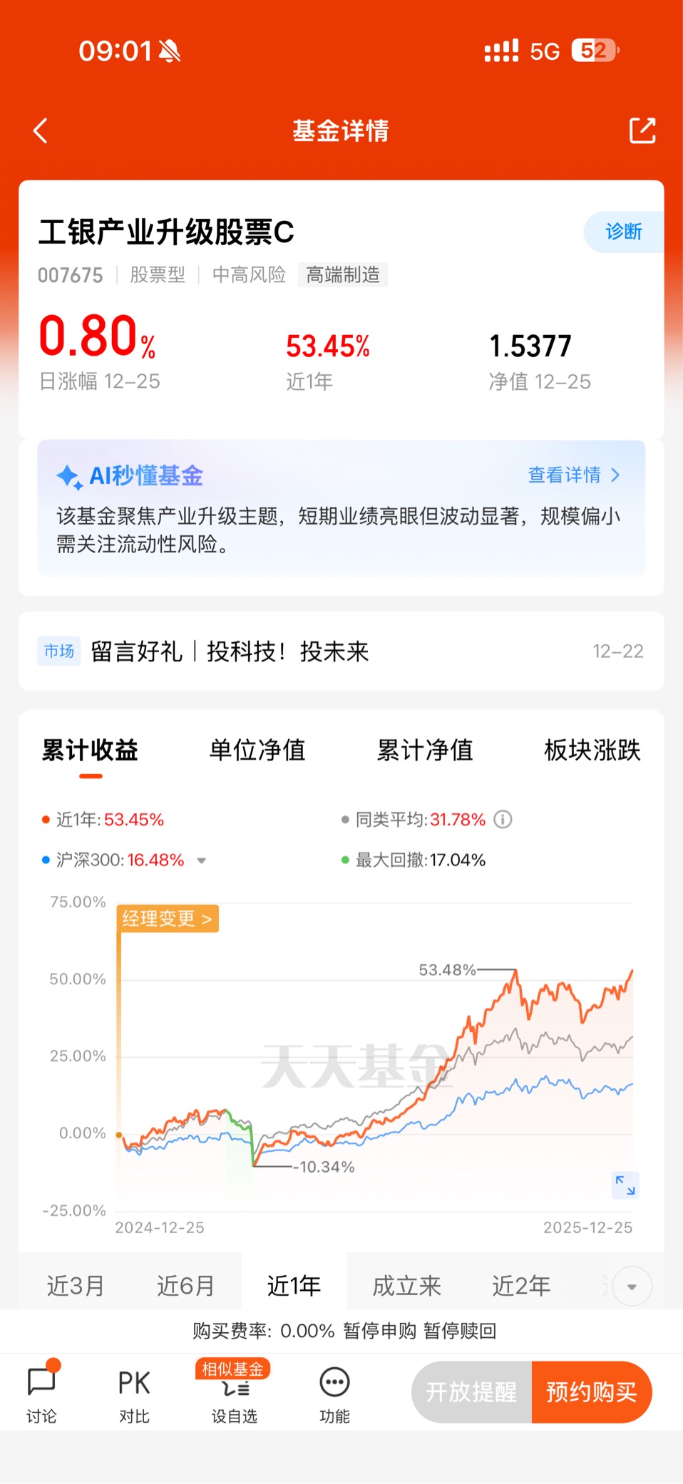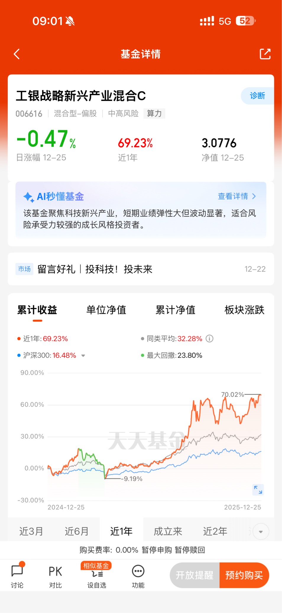 持有过程中,最让我佩服的是基金的抗波动能力和爆发力。今年10月以来,市场经历过几次震荡调整,科技产业指数也有过单日回调,但这只基金凭借集中持仓龙头的优势,很快就收复失地。尤其是12月以来,随着AI算力需求爆发、国产替代政策加码,基金净值彻底开启“加速模式”:近1个月涨幅冲到15.80%,近6个月更是暴涨61.11%,近一年收益率直接突破69.23%,最新净值已经达到3.0776元。这种“震荡时抗跌,行情来时有爆发力”的表现,比很多反复横跳的混合型基金靠谱多了。