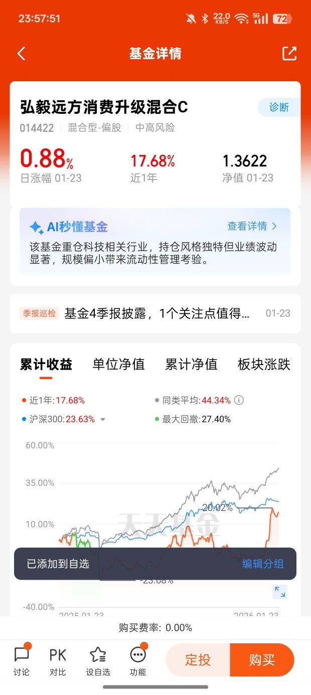 这些场景背后,是消费升级的核心逻辑:AI正在重构“人找服务”为“服务找人”。弘毅远方消费升级的投资策略太懂这个趋势了——股票资产50%-95%聚焦消费升级,其中80%投向相关主题,尤其重仓了AI应用、智能服务等新兴消费赛道,前十大持仓里正是AI赋能消费的标杆。近1个月基金涨幅超31%,用业绩证明了“AI+消费”的爆发力 。$弘毅远方消费升级混合A$