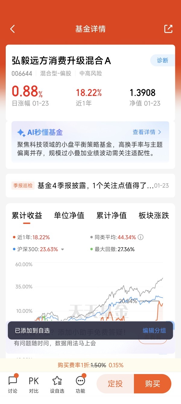持有这只基金一年,不仅获得了不错的收益,更让我对“消费升级”有了新的理解:真正的消费升级不是买更贵的东西,而是用更高效、更贴心的技术,让生活变得更美好。而弘毅远方消费升级C,正是这场变革的“同行者”。