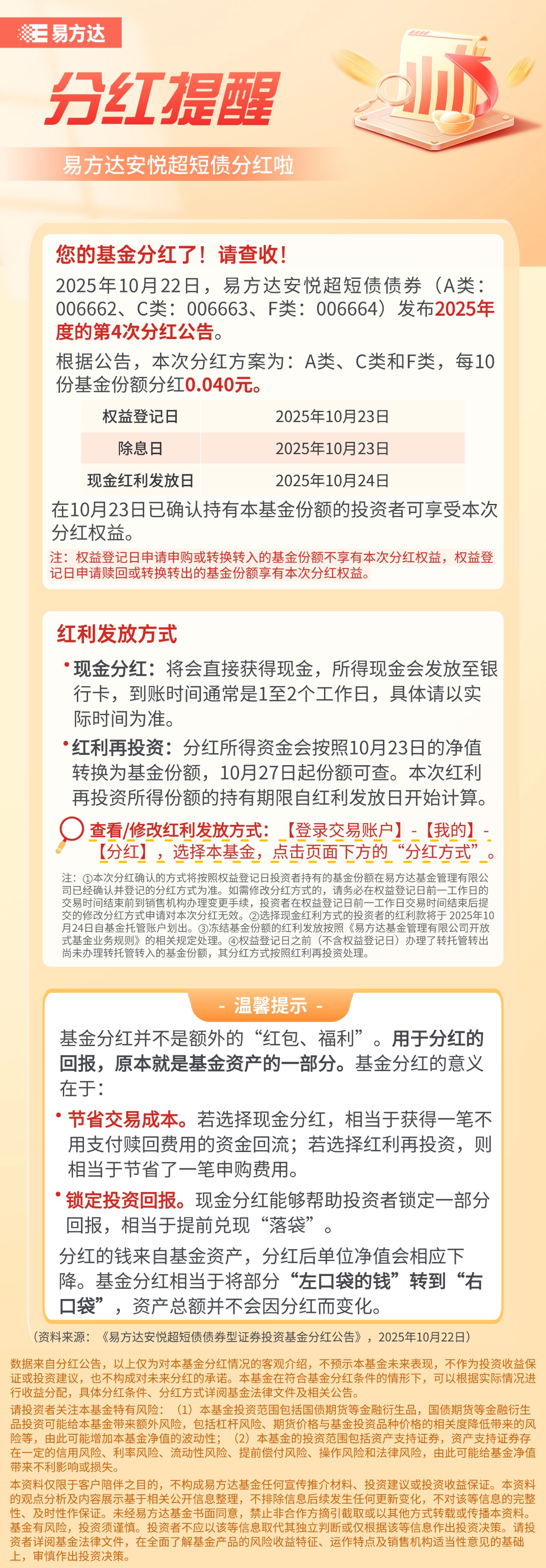 2025年10月22日,易方达安悦超短债债券($易方达安悦超短债A(OTCFUND|006662)$$易方达安悦超短债C(OTCFUND|006663)$$易方达安悦超短债F(OTCFUND|006664)$)发布2025年度的第4次分红公告。