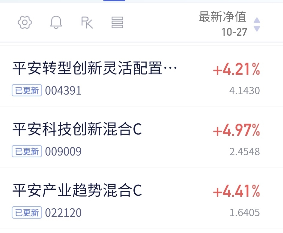 $平安转型创新灵活配置混合C$收益4.21%,太牛了呀,一下子四个多点,也是挺强的一个,看看后续的表现了