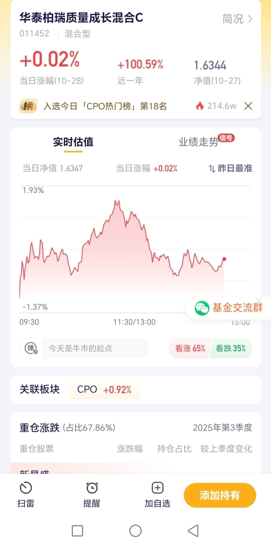 今天CPO板块表现不错,涨了0.92%。很多人都在找能跟着CPO吃肉的基金,华泰柏瑞必须拥有姓名!它不仅入选了今日CPO热门榜,近一年还涨了100.59%。说白了,就是它跟CPO板块联系很紧密,板块涨它大概率也能跟着涨。要是你也看好CPO的行情,华泰柏瑞这只基值得入手,可能会让你在投资里收获满满。$华泰柏瑞质量成长C$ #科技热点摊开业啦#