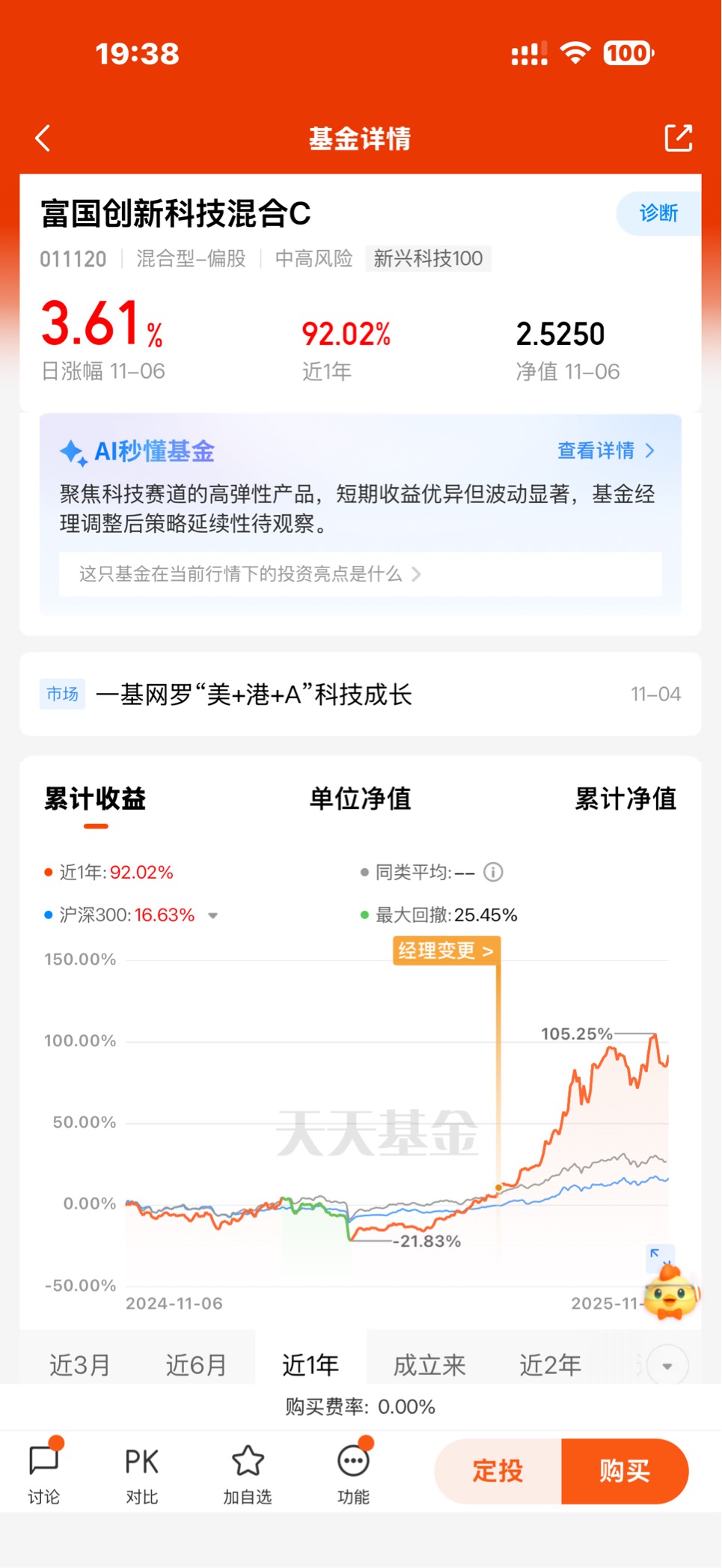 目前搭着国融融盛龙头严选C,也拿了点富国创新科技C,重仓AI算力、光模块、半导体这些硬核方向,53亿规模稳,近6个月涨116%、一年83%,跑赢同类不少。