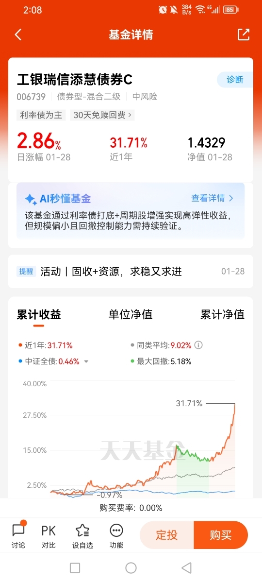 2026年开年的资本市场,在流动性宽松、低利率延续的大背景下呈现出全新的布局逻辑,权益市场回暖但波动加剧,全球降息周期与地缘风险交织,让“固收+”基金的稳健性与黄金等资源品的战略价值迎来双重共振。在这样的市场环境中,兼具固收打底、黄金资源品布局优势的工银瑞信添慧债券A,凭借精准的资产配置与扎实的业绩表现,成为2026年资产配置的优质选择,我对其投资价值高度认可,并将坚定配置。