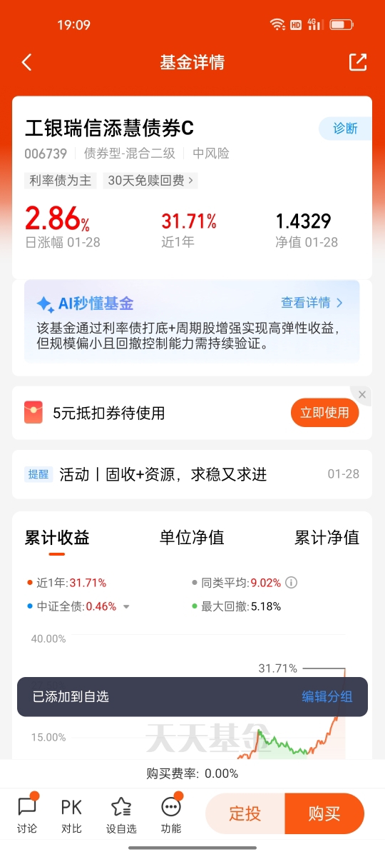 2026年的市场,不会再有“闭着眼买都赚钱”的行情,想要不慌,关键是“不把鸡蛋放在一个篮子里”。工银瑞信添慧A/C的核心逻辑,就是用债券的“稳”对冲风险,用资源股的“涨”放大收益,刚好契合了今年的市场需求。