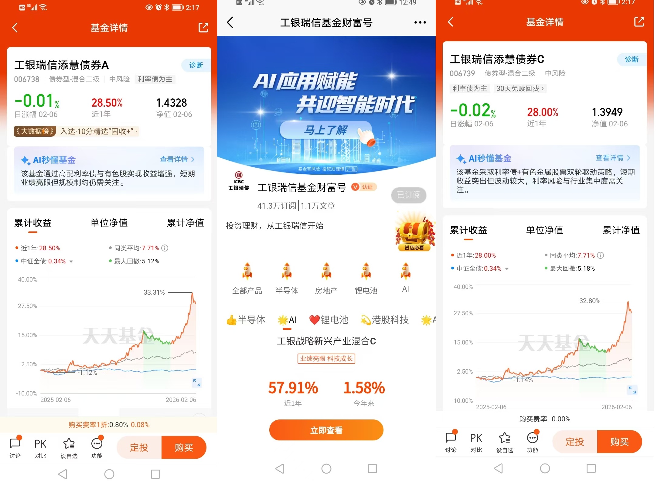 紫金矿业、山东黄金等黄金企业,株冶集团、中国铝业等有色金属企业,2026年也被看好。黄金涨价,这些企业效益就好,股票也会涨。我看好的工银瑞信添慧债券,2025年四季度就重点布局黄金等资源品,前十大重仓股里有多家这类企业,刚好踩中市场热点,这也是我看好它的重要原因。