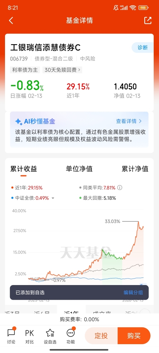 对工银瑞信添汇债券这类产品,我的观点很明确:它是今年组合里非常适合作为“底仓核心”的工具。它帮我解决了最麻烦的固收管理、券种选择、久期控制、权益增强等问题,让我能把更多精力放在整体配置节奏上。我会以它为基础,搭配适度的贵金属方向,构建“固收+资源”的稳健增强组合,不追高、不重仓、不频繁操作,逢低布局、长期持有。