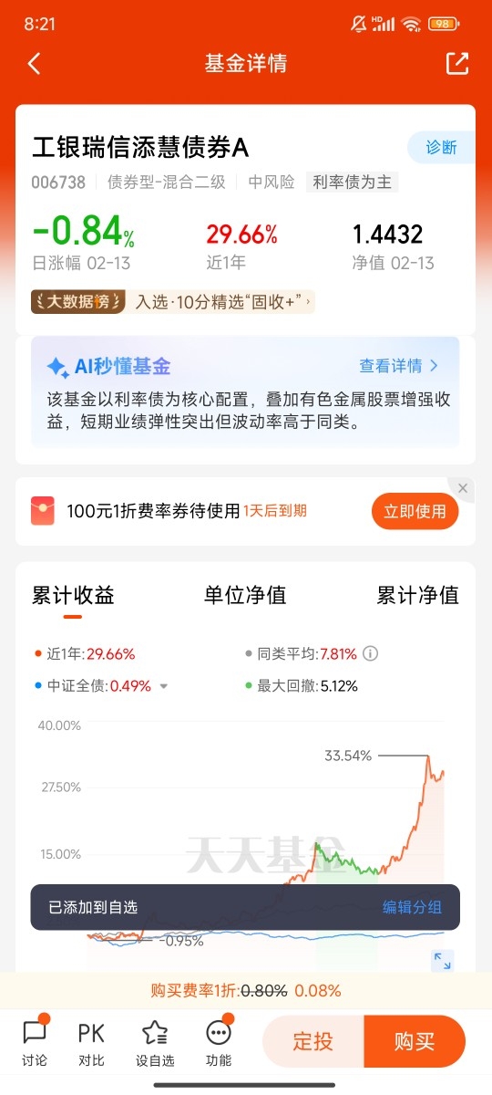 很多人会问,固收+资源,听起来不错,但具体怎么落地?自己配债券、配黄金、配股票,太费精力也不好控制比例。对我来说,更省心、更专业的方式,就是借助优质的固收+基金。这里我想重点说说工银瑞信添汇债券,这只基金以固收为核心、辅以权益资产的策略,刚好契合我今年“稳+进”的需求。