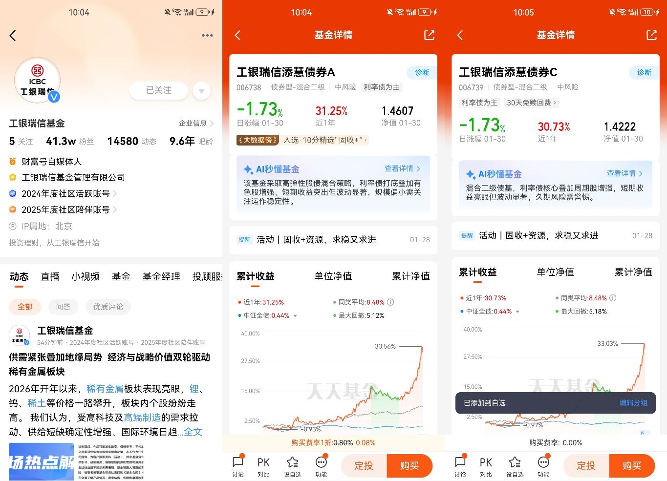 #固收+资源# 我很喜欢固收加基金,我已经配置、定投、长期持有了不少固收加基金。数据表明,固收加基金开年规模攀升到2.99万亿,创出新高,且在1月份业绩有所回暖。在存款利率下行与存款搬家趋势下,固收加基金的稳健属性使得这类基金能持续承接避险资金。固收加基金以债券作为底仓,能在经济周期的不同阶段,为投资组合提供相对稳健的基础收益。而基金的多元配置设计,又能让投资组合捕捉不同周期中的市场机遇。持有固收加基金时,不需要投资者频繁调整仓位,很适合长期持有。 $工银瑞信添慧债券A(OTCFUND|006738)$以固收资产为主,另外配置了部分黄金等资源品。我十分看好黄金。央行购金潮与去美元化的长期逻辑未改,这将为金价提供坚实底部。近期市场波动加剧、宏观不确定性加剧,黄金成为资金规避风险的重要选择。而矿产供给刚性、开采成本抬升,又从基本面为其价值托底。央行持续增持黄金、去美元化趋势深化,也让黄金在资产配置中继续保有稳定的价值。@工银瑞信基金