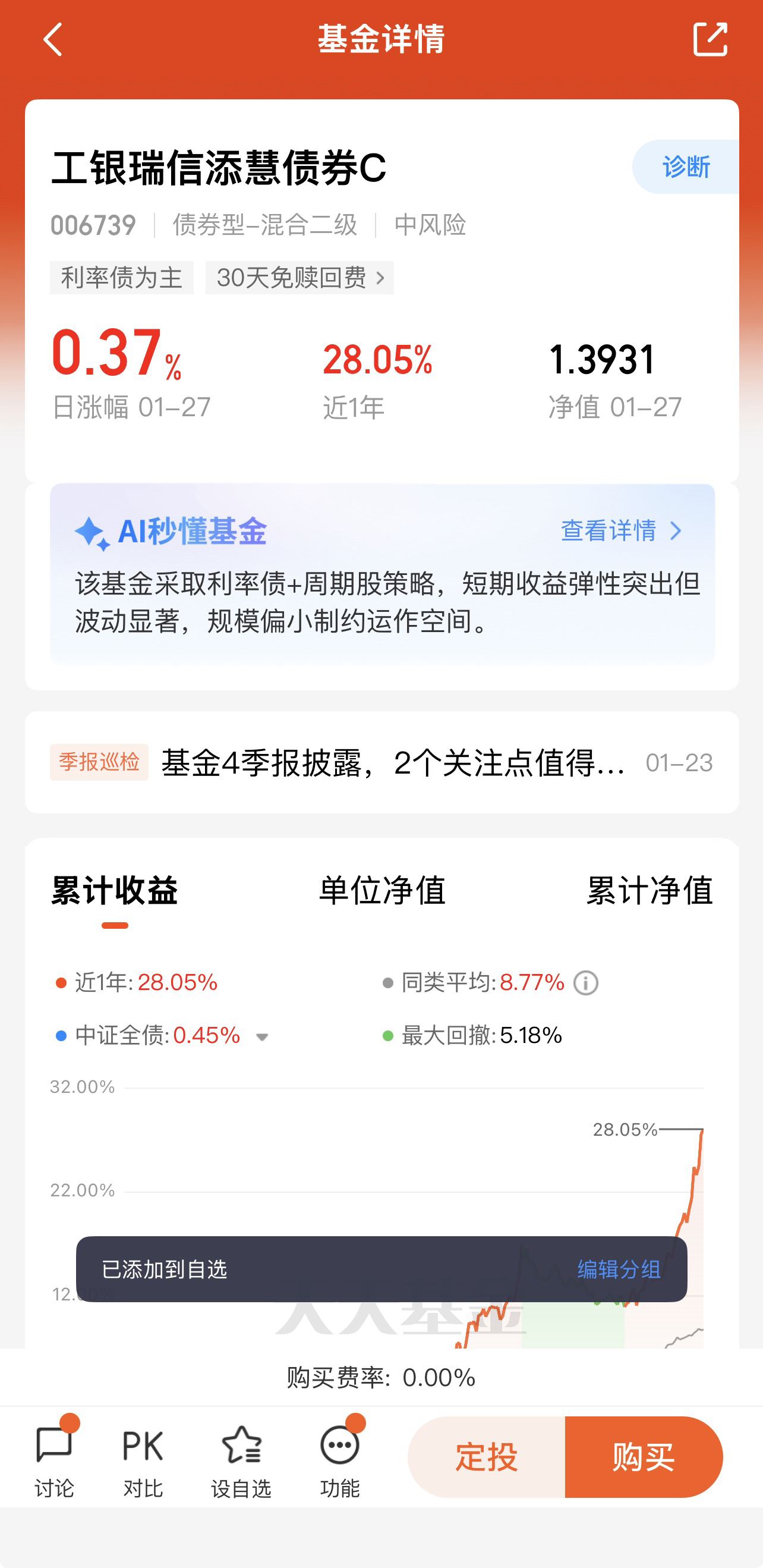 基金持仓债券以高等级信用债为主,信用风险较低,且利率策略调整灵活,可根据市场利率变化优化组合久期,捕捉债券价格波动收益。权益仓位聚焦优质个股,估值处于合理区间,叠加打新收益增厚,业绩确定性较强。截至2026年1月28日,基金净值1.3931,长期呈稳步上行趋势,具备上车的估值与业绩基础。