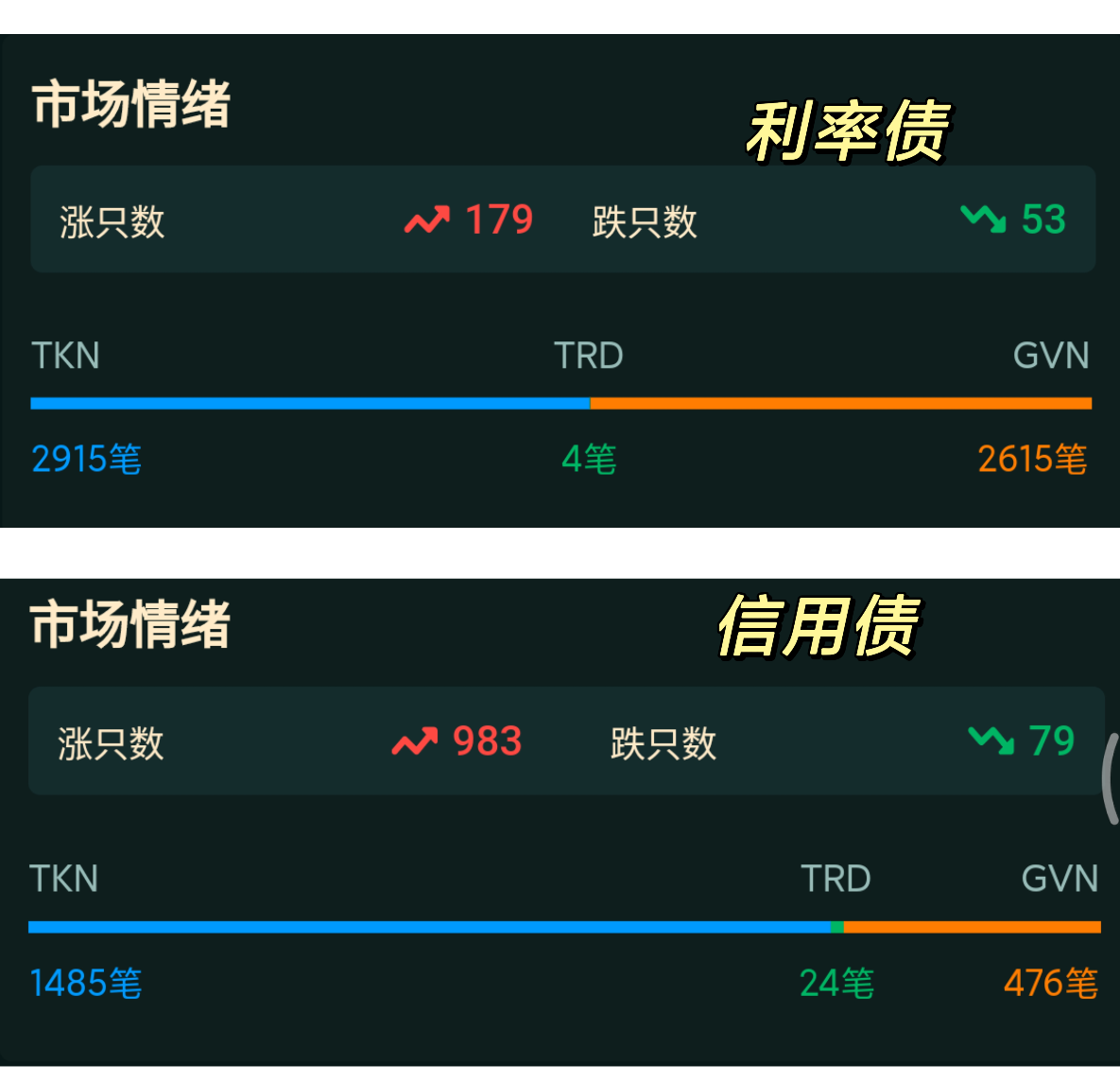 双债情绪目前来看都很不错,信用债情绪更在火热,双债都是GVN(买家报价成交)笔数差不多<TKN(卖方报价成交),证券为主要买入力量,基金为主要卖出力量,银行由买入转为卖出。