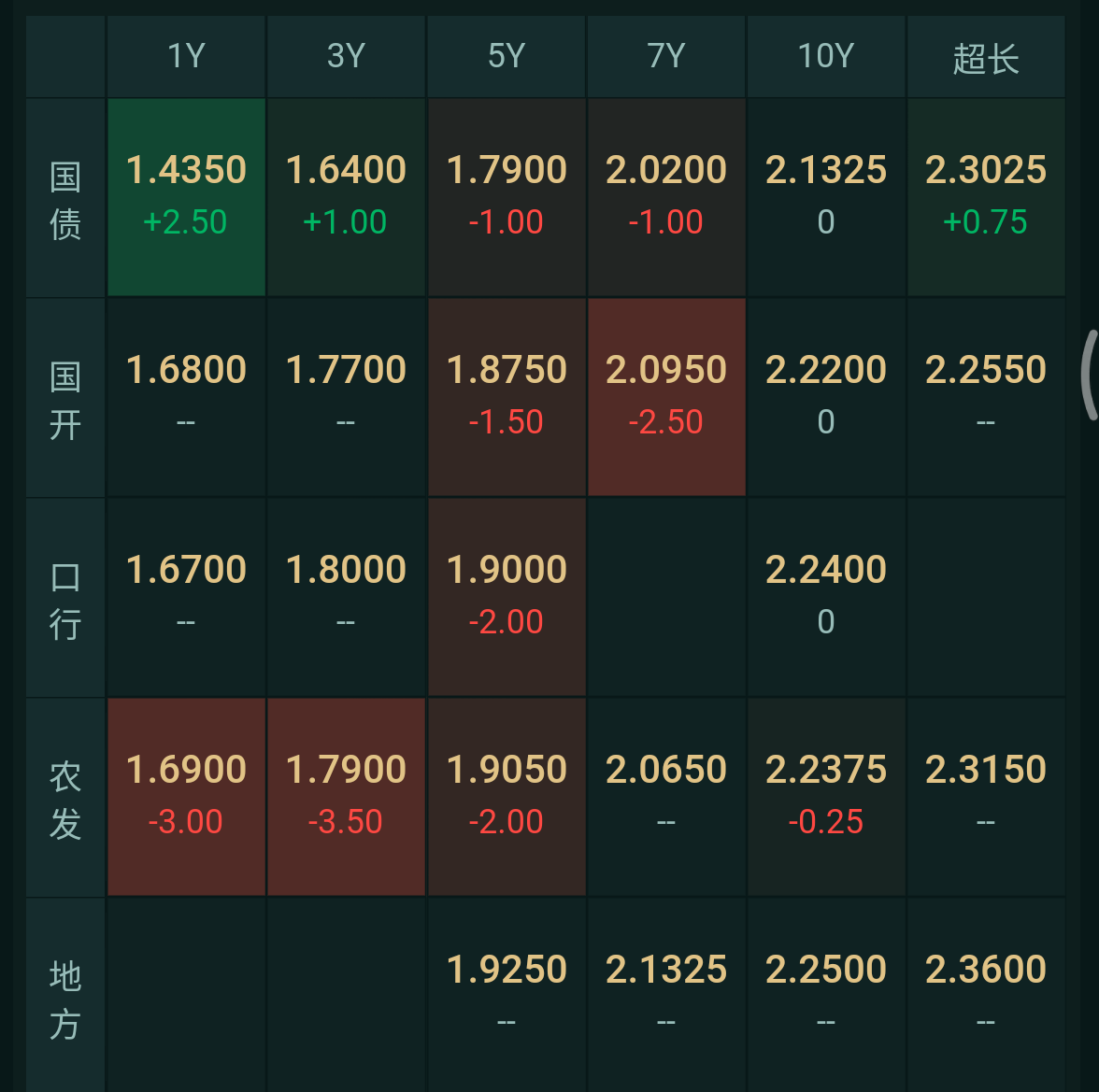 银行间市场主要利率债收益率与债基涨跌是反向关系,越跌越好。