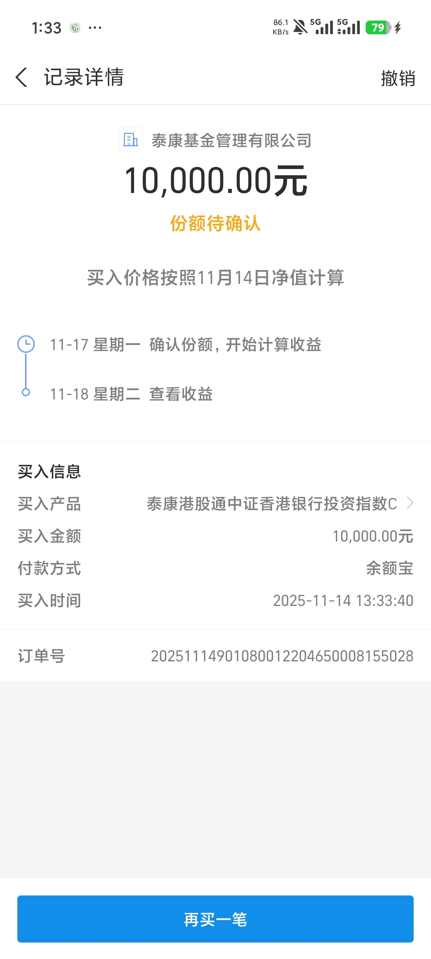 美联储12月降息概率降低至50%,市场对科技股重新定价,昨夜美股大幅回调,今天A+H的科技也没能走出独立行情,市场再次开始进入避险资产,涌入银行、红利等,所以我今天拿1w$泰康香港银行指数C$ ,