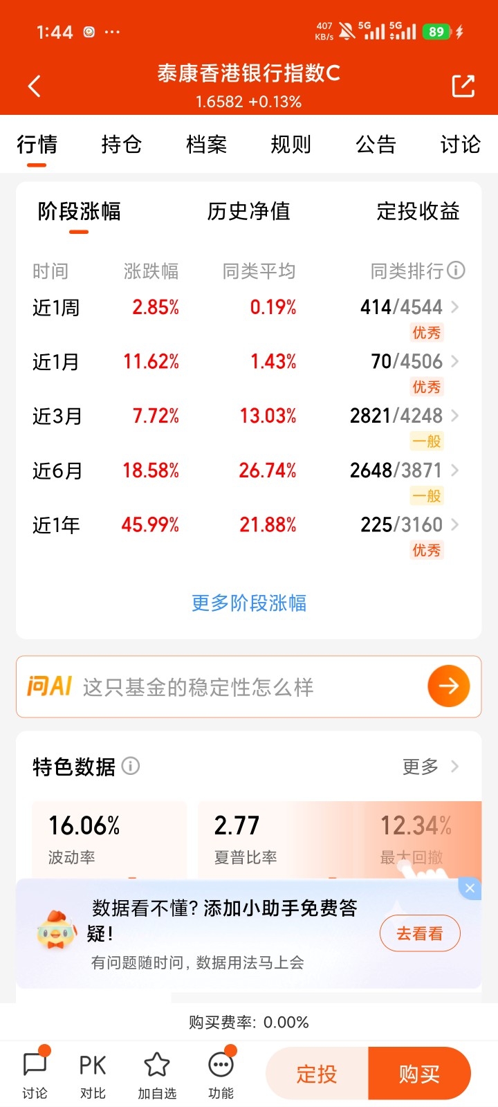 这支的话就是跟踪港股银行,港股的银行估值更低,股息率更高,上涨空间跟大。这支涵盖了建行、汇丰、工行等优质标,近一个月涨11.62%,近一年涨45.99%。