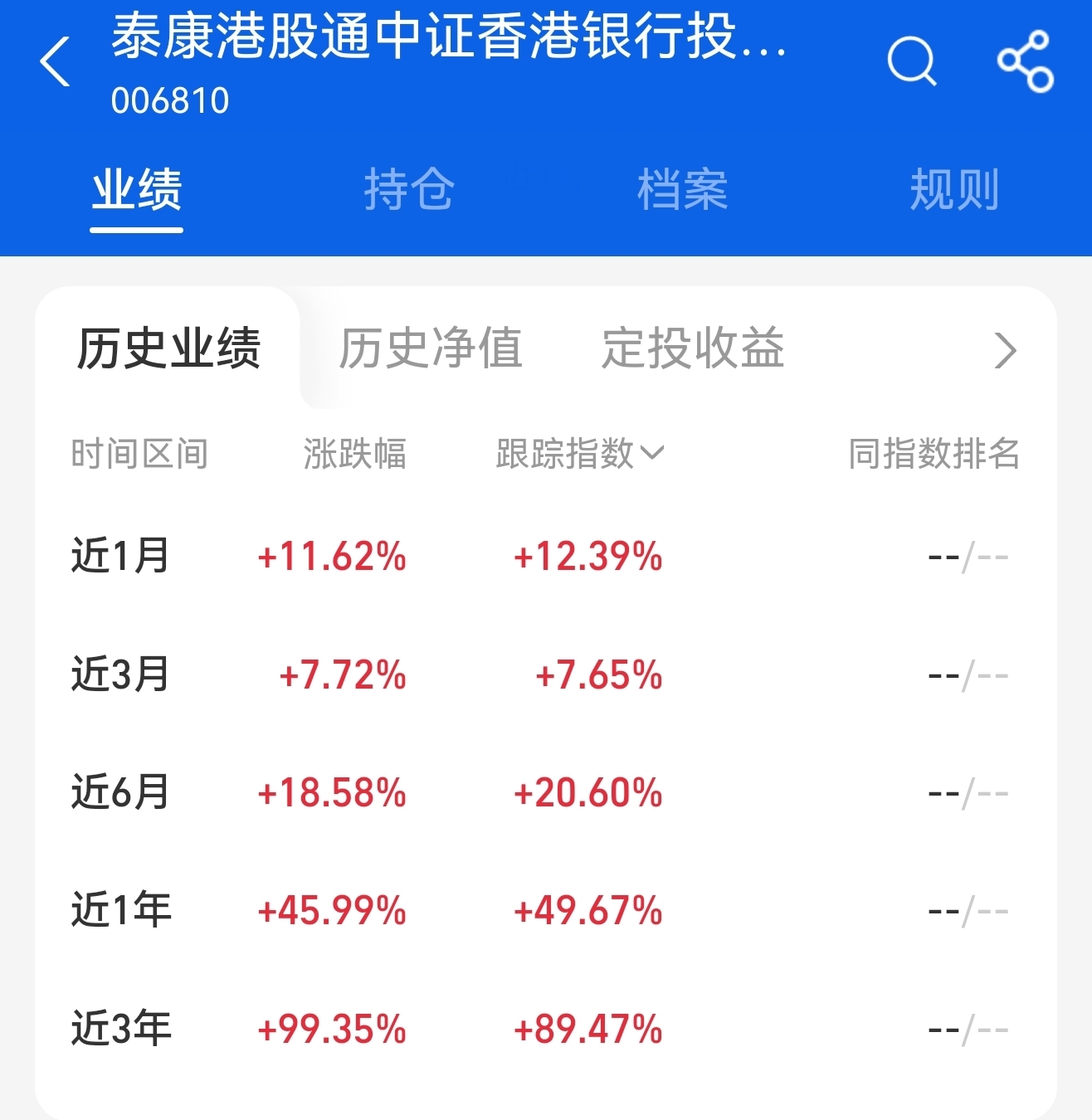 对我而言,银行板块上涨逻辑清晰,后续空间可期,布局窗口已打开!我关注的泰康港股通中证香港银行投资指数C表现突出,近一年涨幅45.99%,近三年99.35%跑赢恒生科技指数,估值合理且防御性拉满,同时具备突破潜力。持仓涵盖建行、汇丰控股等龙头银行,分散风险的同时捕捉行业红利。当前香港银行板块估值偏低相较国内存款具备收益优势,今日直接加仓了,期待后续继续吃肉!