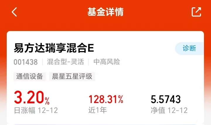 今天A股回暖啦,大科技板块也是表现十分给力,带领市场整体反弹!CPO赛道再度回归强势行情呢,相关基金也是表现不错呢,$易方达瑞享混合E(OTCFUND|001438)$今天上涨了3.20%,优于大部分同类呢。这基基金经理调仓灵活,实力毋庸置疑。而且各阶段性业绩表现都不错,更有长期穿越周期的硬实力,成立以来涨幅超4倍,我打算继续拿着啦。