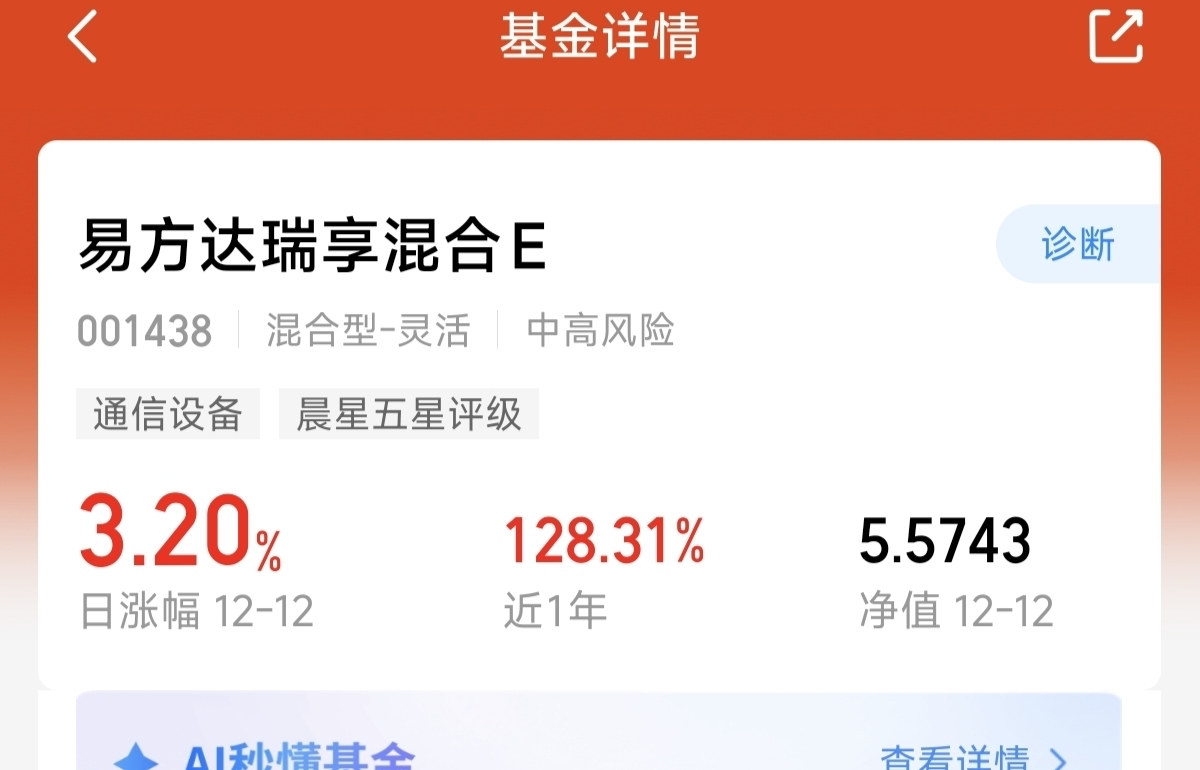 今天的市场集体回暖。还是科技表现的比较强。CPO盘中探底回升,继续上涨创新高。$易方达瑞享混合E$ 这只主动的科技混合基金。聚焦CPO表现好,今天上涨了3.2%,近一年涨幅128.31%,同类业绩长期做到了优秀。基金经理,深耕科技多年。管理该基金以来,涨幅已经超400%。长期稳定盈利的能力强。我会继续补仓。