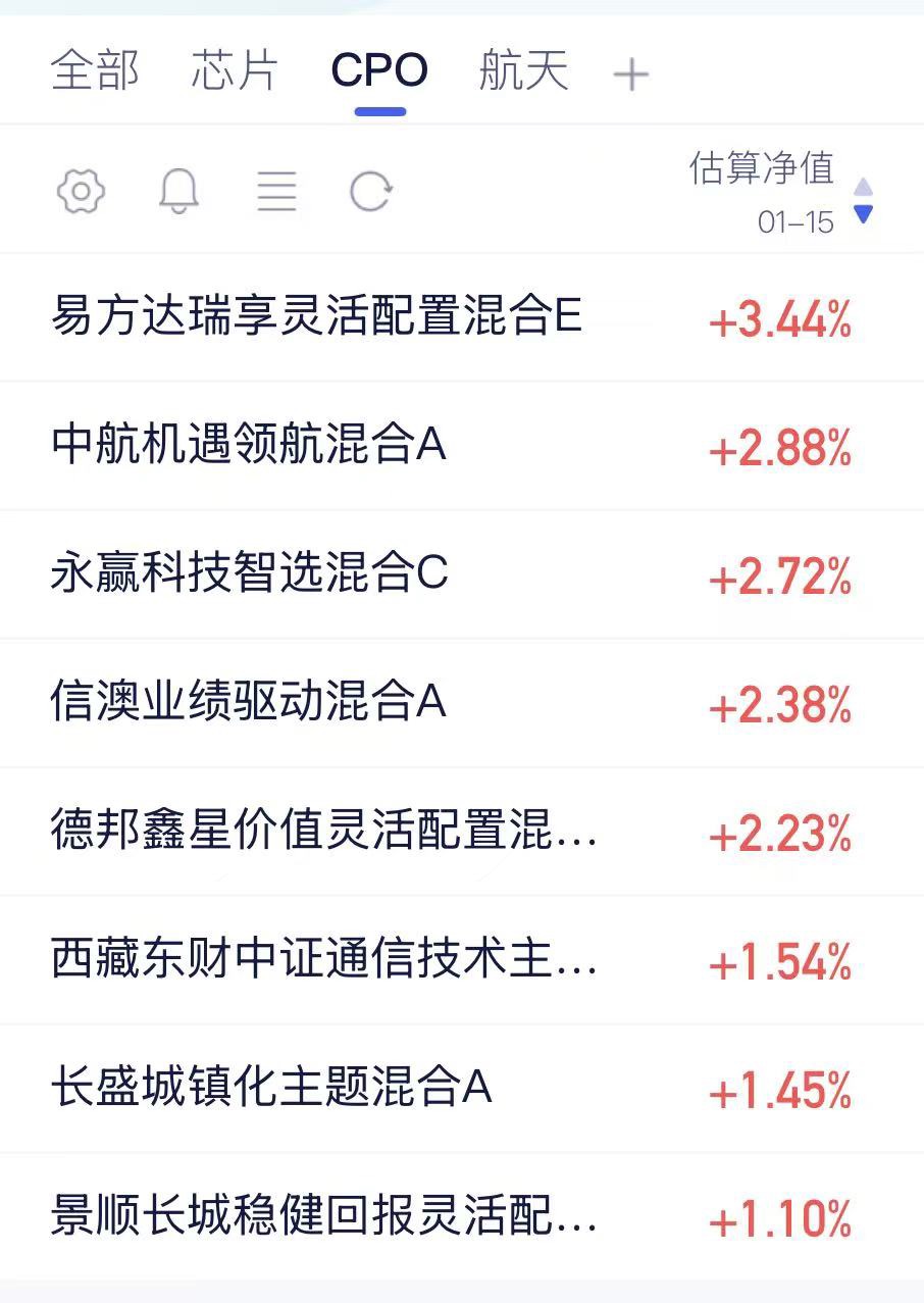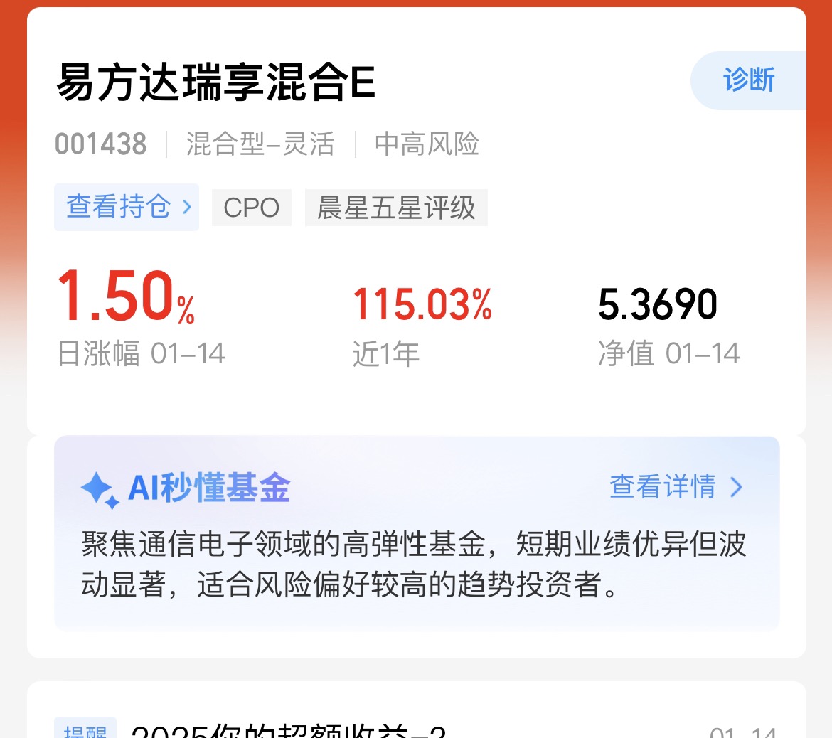 今天三大指数涨跌不一,不少赛道纷纷下探,可CPO板块却扛起领涨大旗,逆势走出上涨行情。$易方达瑞享混合E$ 因为重仓CPO核心标的,今日估值大涨3.5%,各阶段业绩都很亮眼,跟着这位基金经理布局,还是比较安心的。