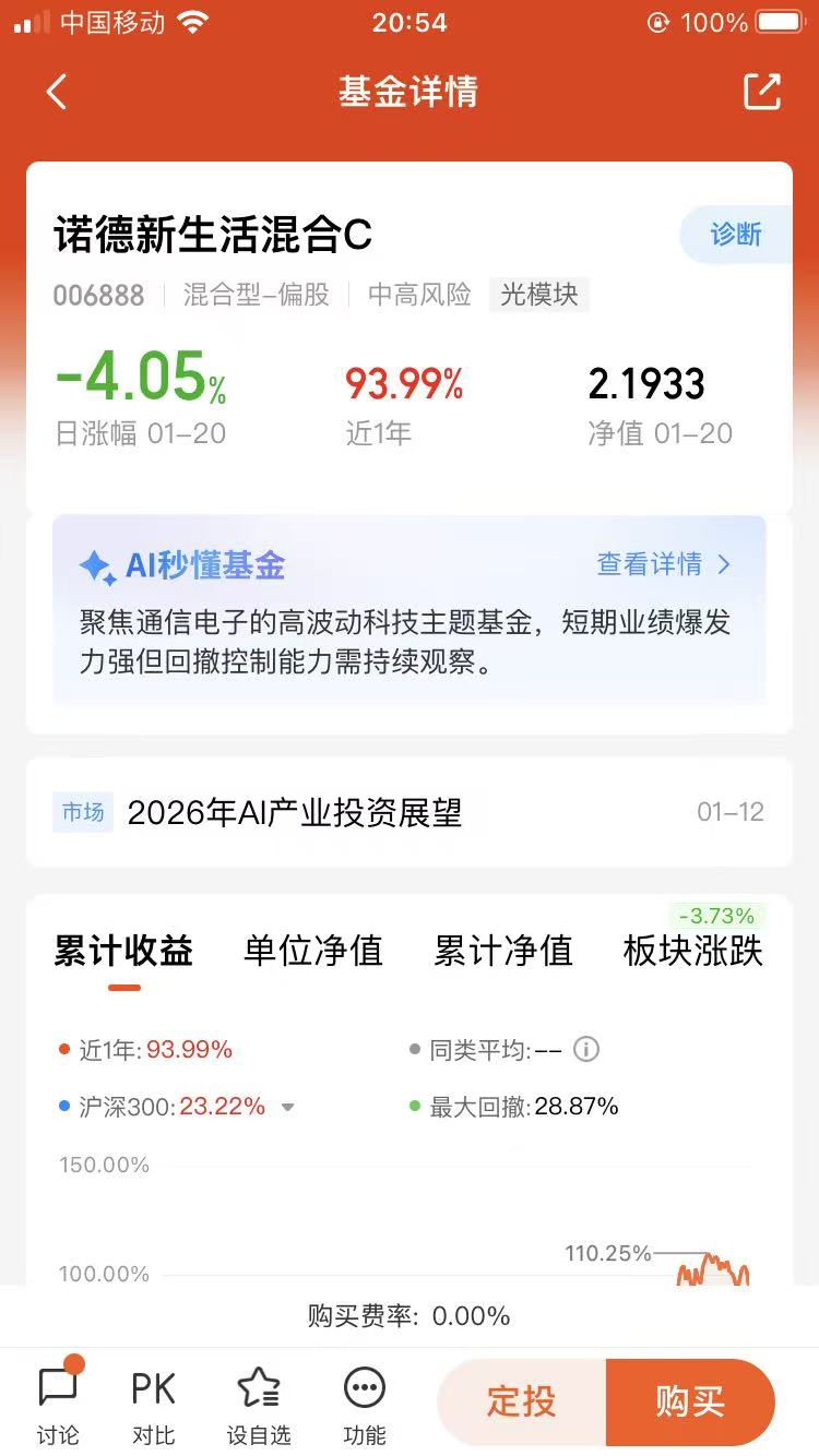 再看诺德新生活混合 C,这只中高风险偏股混合基金,股票仓位常年维持在 90% 以上,重点布局电子、通信等 AI 核心产业链,前十大重仓涵盖源杰科技、新易盛、海光信息等 AI 算力与光模块龙头,精准踩中 AI 发展主线。基金经理周建胜任职期内业绩亮眼,近一年收益超 108%,大幅跑赢业绩基准,展现出出色的行业选股与组合管理能力。但高仓位与集中持仓也带来较高波动,近一年最大回撤超 60%,对投资者风险承受能力要求较高。C 类份额无申购费,持有满 7 天免赎回费,费率设计友好,适合能承受短期波动、长期看好 AI 赛道的积极型投资者。若市场出现 AI 商业化不及预期等风险,该基金净值可能面临较大调整,投资时需做好仓位控制与长期持有规划。@诺德基金