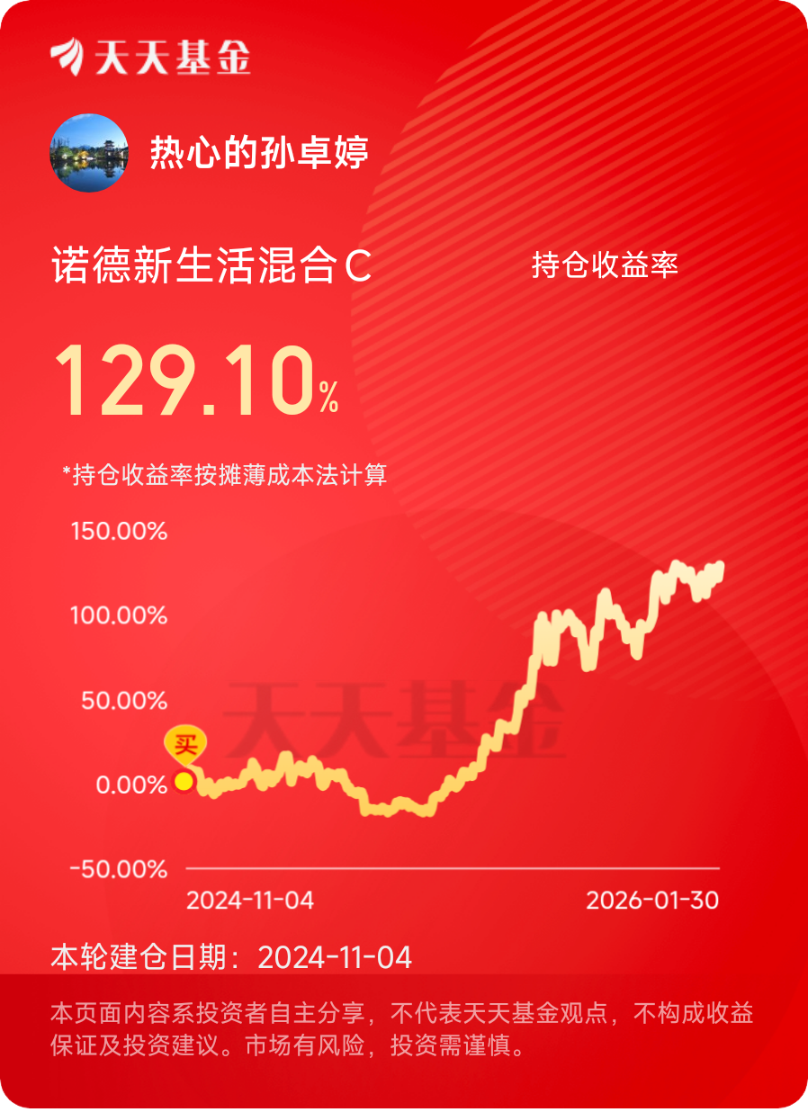 最后想说说,作为刚毕业的新员工,投资不是一夜暴富的捷径,是认知提升的过程。诺德新生活C给我的不仅是129%的收益,更是让我读懂“赛道选对、基金选精、长期坚守”的投资本质。AI赛道不是神话,是扎扎实实的产业革命;这只基金不是妖基,是踏准时代节奏的优质成长标的。