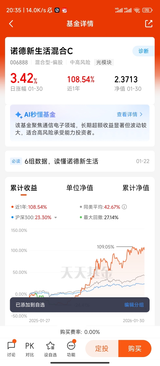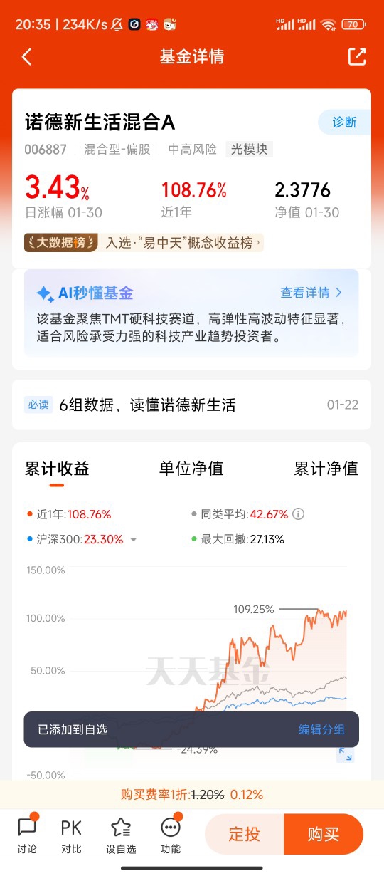 从实操体验来看,持有诺德新生活混合C的一年多时间里,我最大的感受是“省心、放心、有获得感”。作为普通投资者,我没有精力深度研究AI产业链的技术细节与个股基本面,而基金经理凭借专业投研团队,持续跟踪全球AI技术迭代、供需格局与政策导向,在算力板块调整时及时优化持仓结构,在应用端崛起时提前布局,让组合始终贴合产业趋势。同时,C类份额的费率设计适合中长期持有与定投,我通过每周定投的方式摊薄成本,忽略短期净值波动,聚焦AI产业长期成长,最终收获了可观的收益,也彻底告别了过去追涨杀跌、盲目跟风的投资误区。@诺德基金 @坚毅的陶全 @平平淡淡来理财