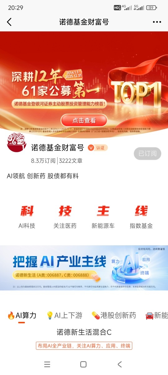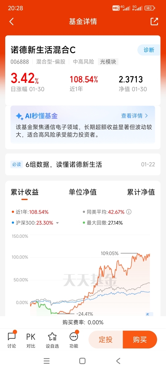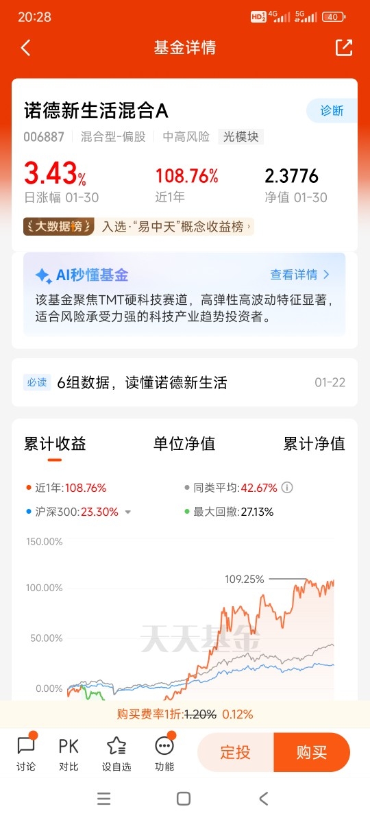 当然了,AI赛道看着热闹,细分领域多、波动也不小,普通投资者自己研究个股,很容易踩中“纯概念炒作”的坑,这时候选一只精准布局AI的基金,把专业的事交给专业的人,就省心多了,而诺德新生活混合,就是这波AI行情里的“优等生”。