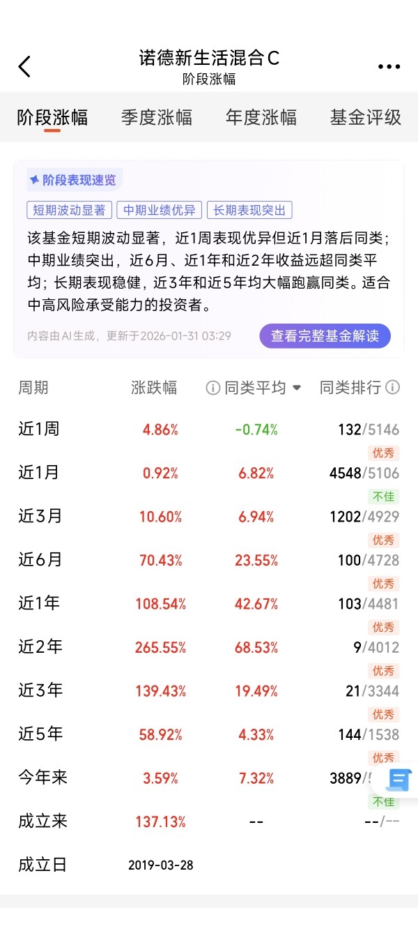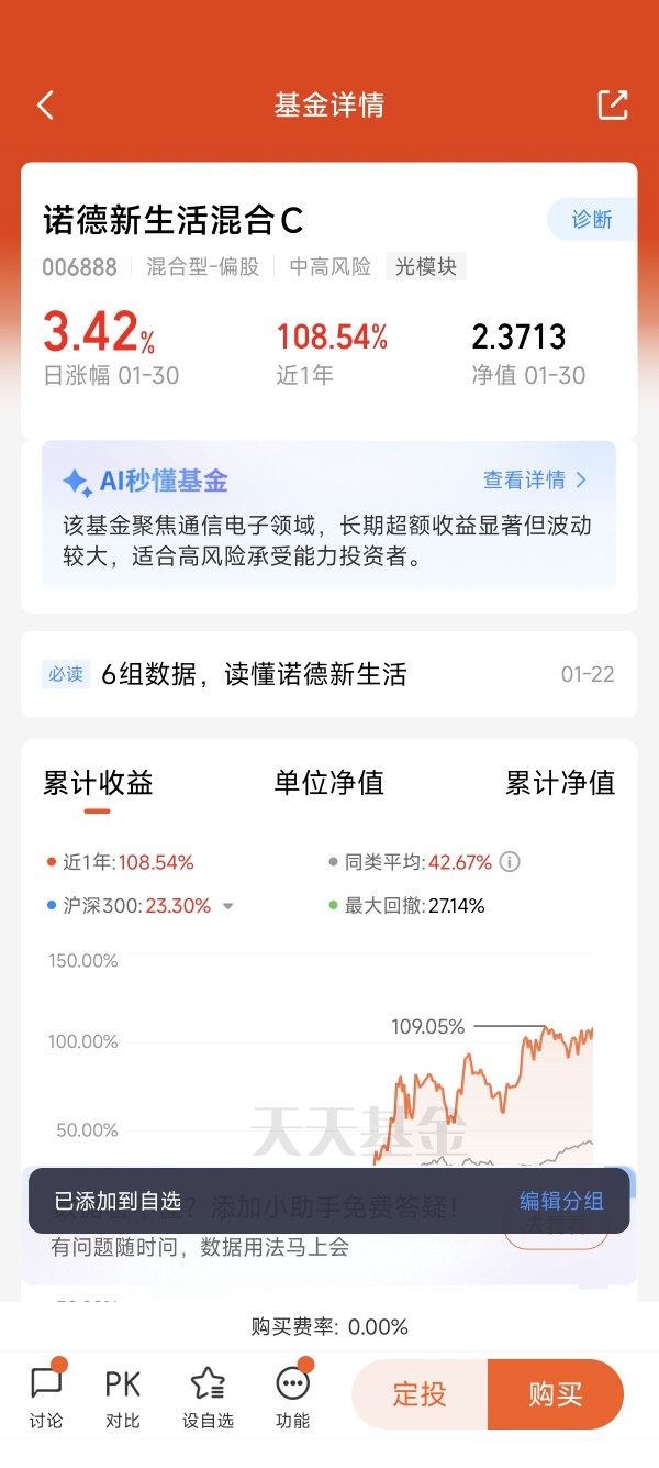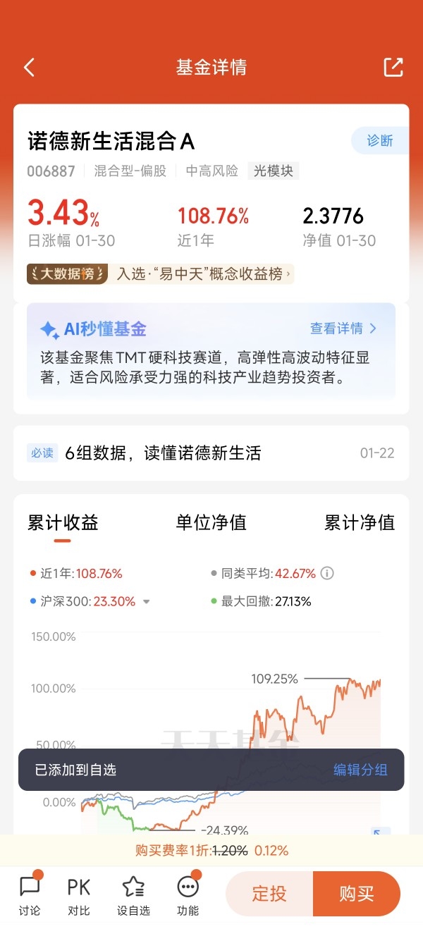 嗨,各位攒钱搭子们,仓鼠君来交作业啦!今天不聊怎么省奶茶钱,咱们聊点“大”的——如何让攒下的每一分钱,坐上AI这艘时代的巨轮。过去半年,我几乎所有的定投子弹,都给了 诺德新生活混合C(006888)。这不止是一次投资,更像是我对2026年甚至更远未来的一次投票。