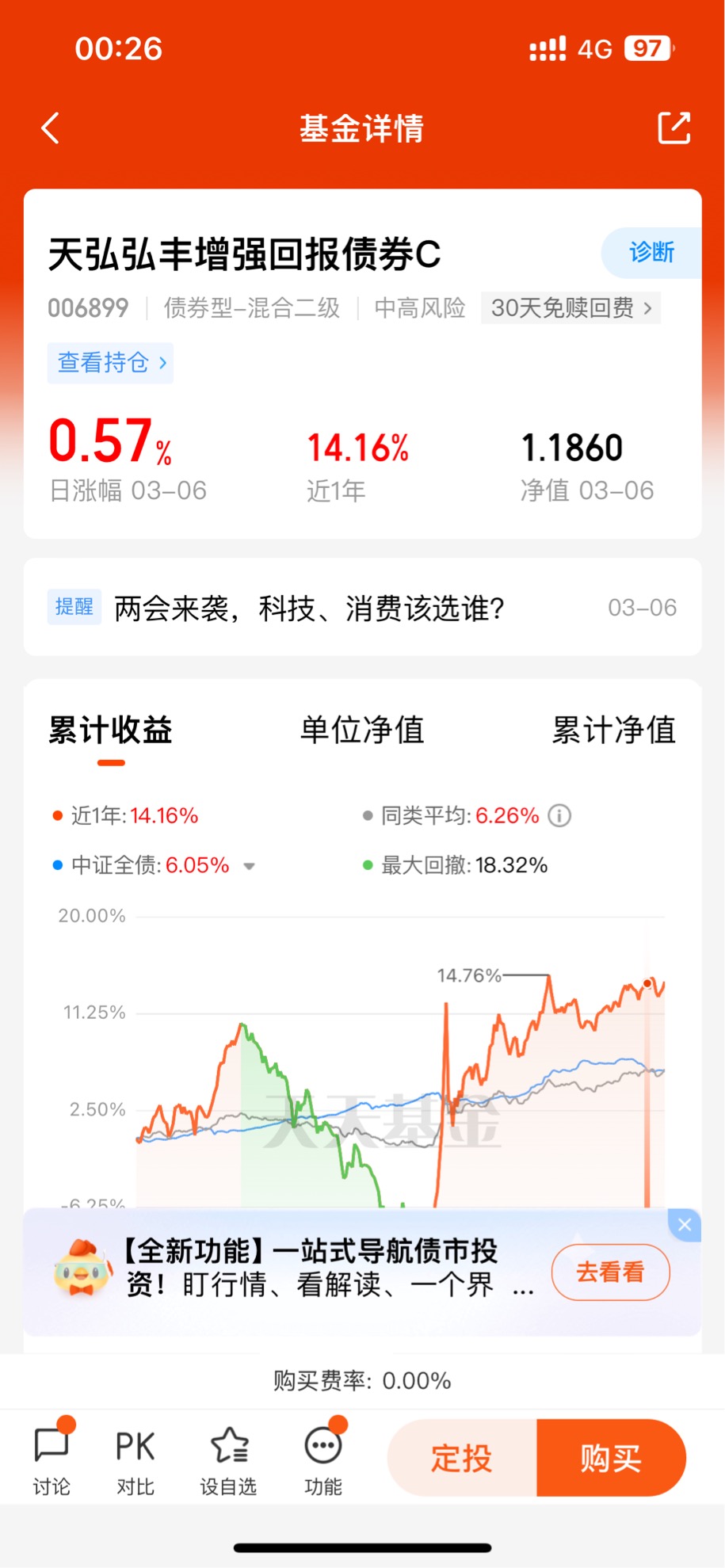 截止3月6日,天弘弘丰增强回报债券C近1年的收益率为14.16%,近6月收益22.42%,同期同类平均收益6.18%,业绩亮眼;杜广和胡东两位基金经理均具备丰富的宏观市场分析与策略研究经验,拥有多年宏观利率策略与信用研究经验,具有完善的债券投研框架。擅长把握宏观利率走势,对择时具备深刻见解,在此基础上运用固收类属资产轮动策略,灵活调整组合久期与配置品种。