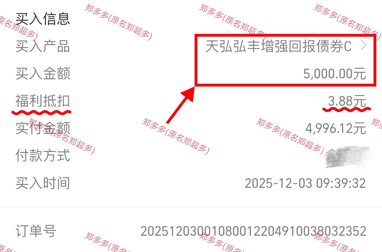 毕竟这只从表现来看有目共睹,近6个月上涨12.06%,近1年上涨了14.24%。评论区6楼还有红包,不等了,我个人开个新仓,入手5000元{$天弘弘丰增强回报债券C$}。