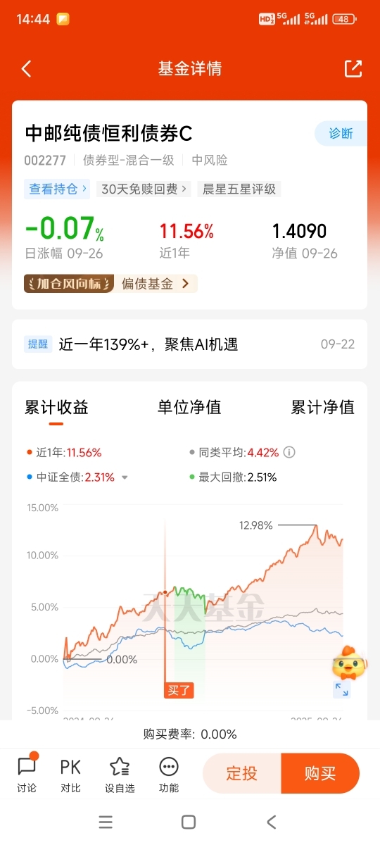 想从纯债转混债又怕波动?$中邮纯债恒利债券C$ 只投可转债和纯债,波动小适配过渡。近三月已收200多枚蛋,0.3%管理费更是混债里的低水平,省心又划算。