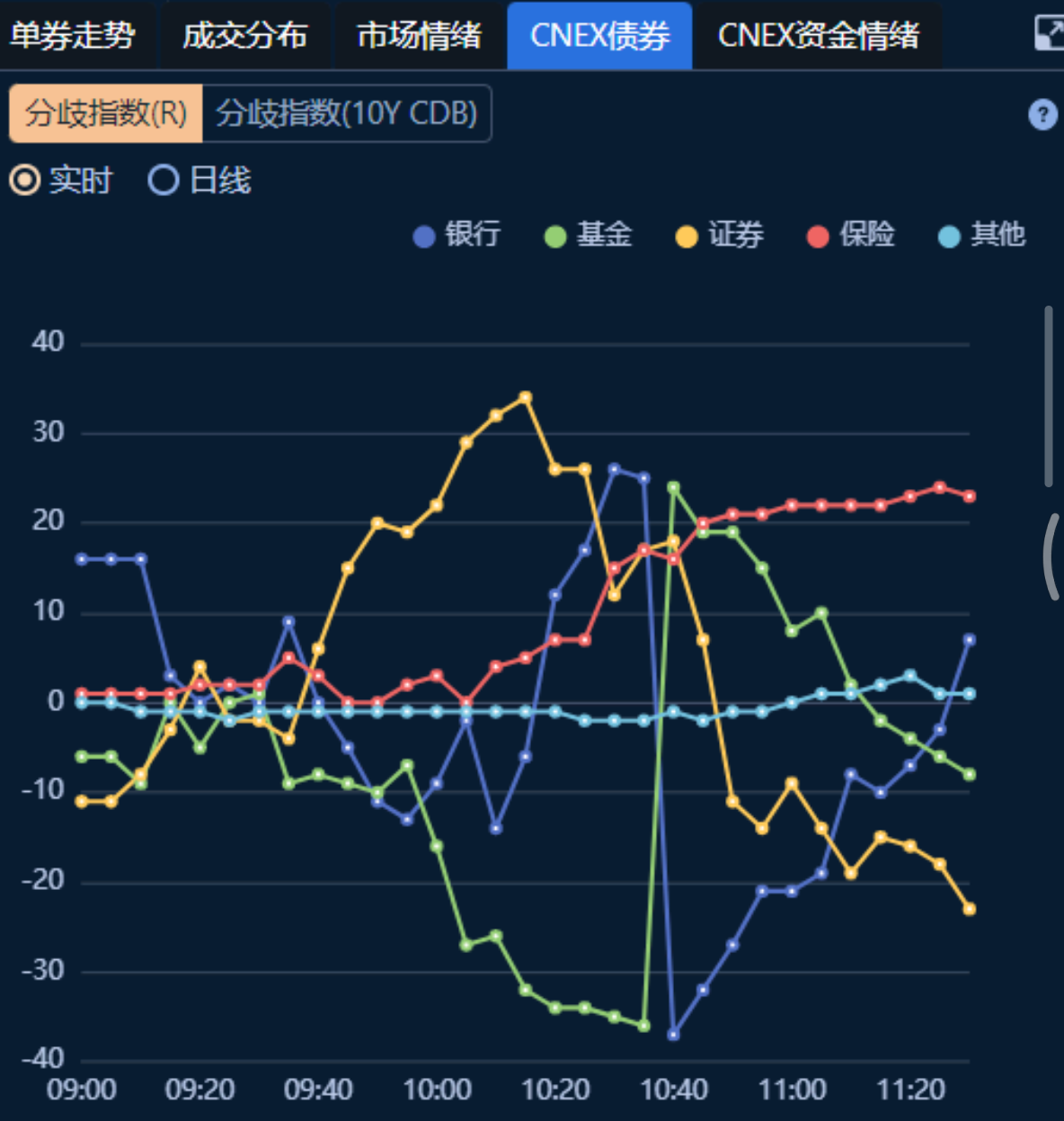 债券分歧指数来看,早盘各机构多空博弈激烈,上午10:40左右,银行、基金交投方向快速互换,临近午间再次扭转。