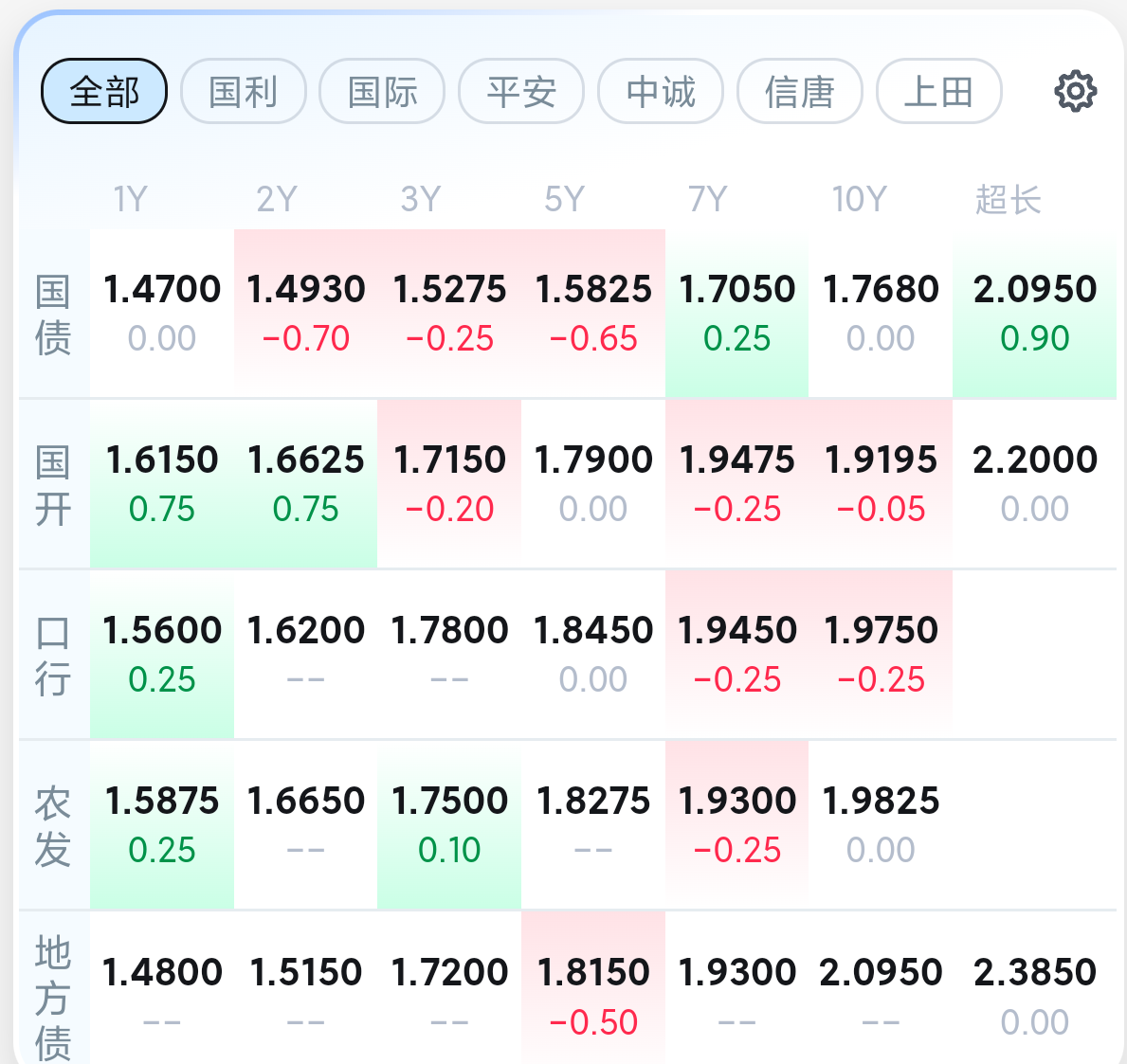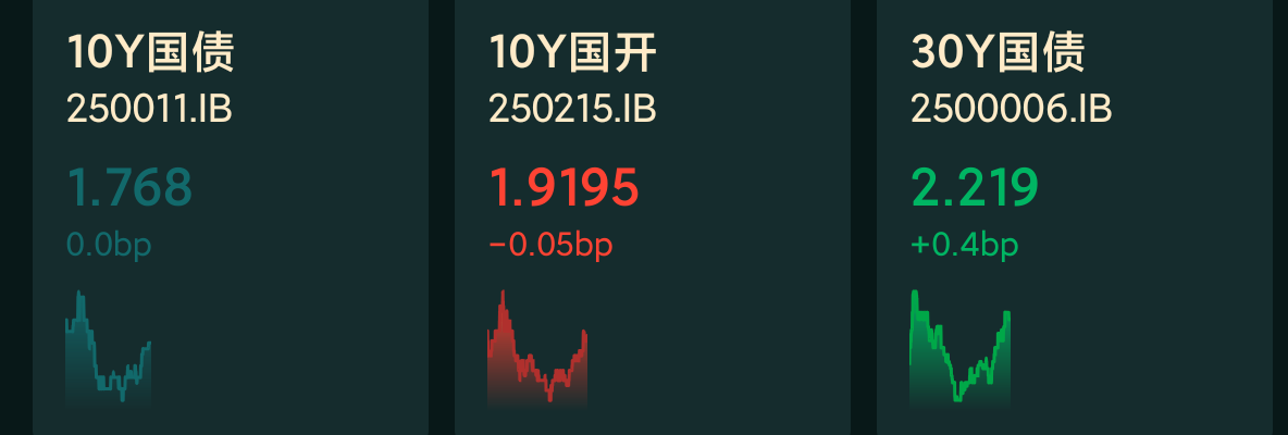 十年期国债收益率:1.768%,-0BP(国债收益率越跌,债市越涨)