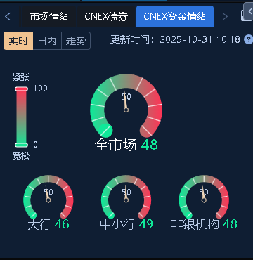DR001报1.31%左右,DR007报1.45%左右,资金情绪均衡偏松(CNEX资金面情绪指数在48)