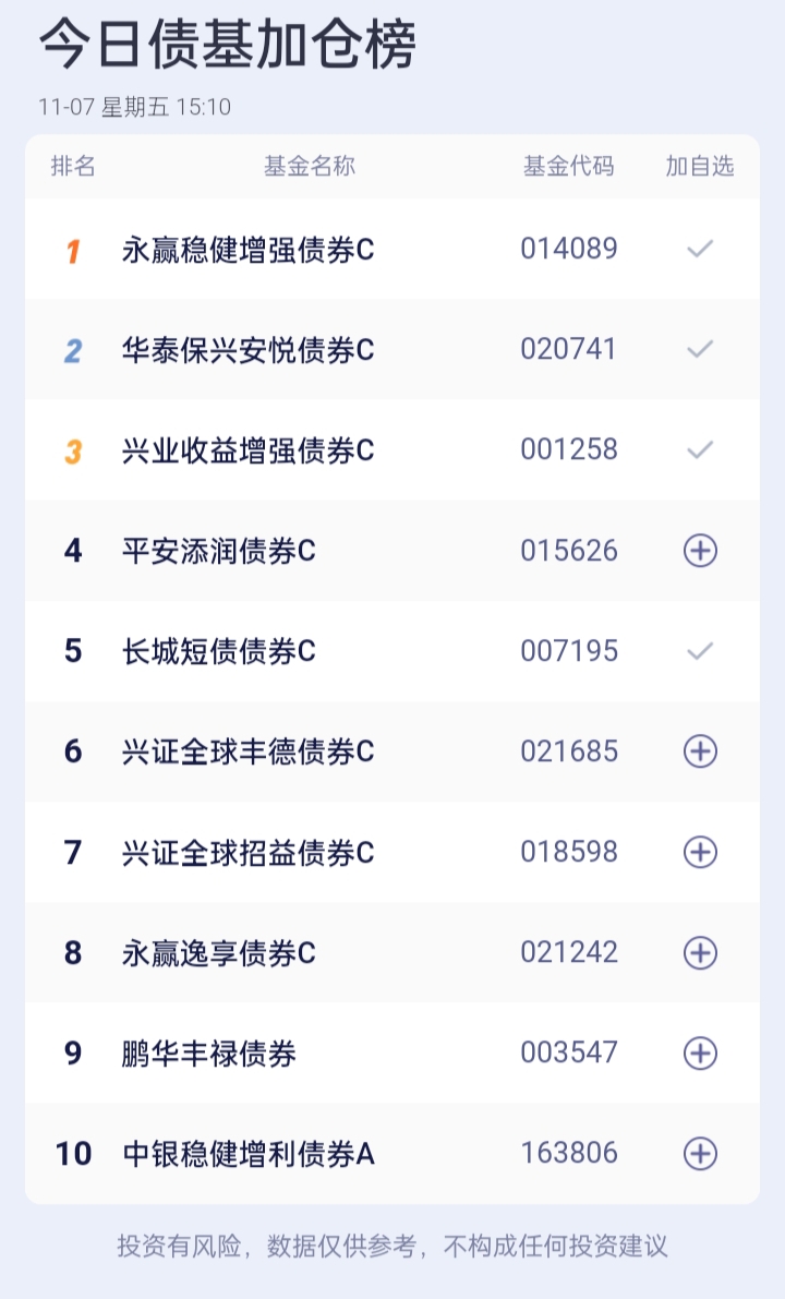 $华泰保兴安悦债券C(OTCFUND|020741)$。$易方达增强回报债券A(OTCFUND|110017)$。$华泰保兴安悦债券A(OTCFUND|007540)$。$永赢稳健增强债券C(OTCFUND|014089)$。$东方添益债券(OTCFUND|400030)$。$方正富邦鸿远债券C(OTCFUND|015909)$。$南方中债7-10年国开行债券指数E(OTCFUND|013594)$。$富国优化增强债券E(OTCFUND|018980)$。$博时恒乐债券C(OTCFUND|014847)$。$国泰惠丰纯债债券A(OTCFUND|007214)$